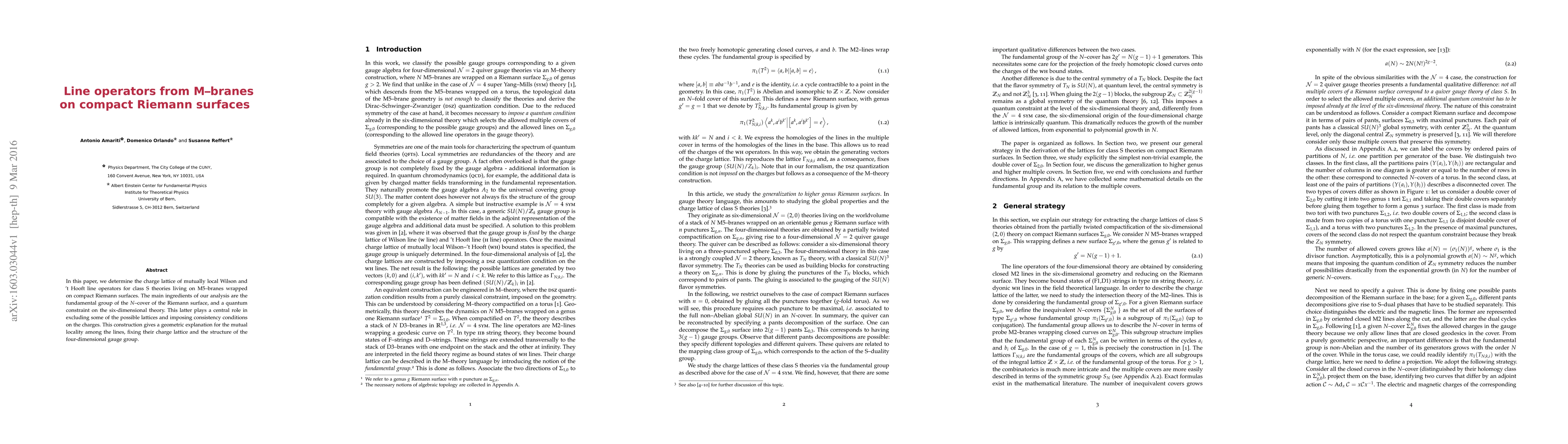In this paper, we determine the charge lattice of mutually local Wilson and 't Hooft line operators for class S theories living on M5-branes wrapped on compact Riemann surfaces. The main ingredients of our analysis are the fundamental group of the N-cover of the Riemann surface, and a quantum constraint on the six-dimensional theory. This latter plays a central role in excluding some of the possible lattices and imposing consistency conditions on the charges. This construction gives a geometric explanation for the mutual locality among the lines, fixing their charge lattice and the structure of the four-dimensional gauge group.