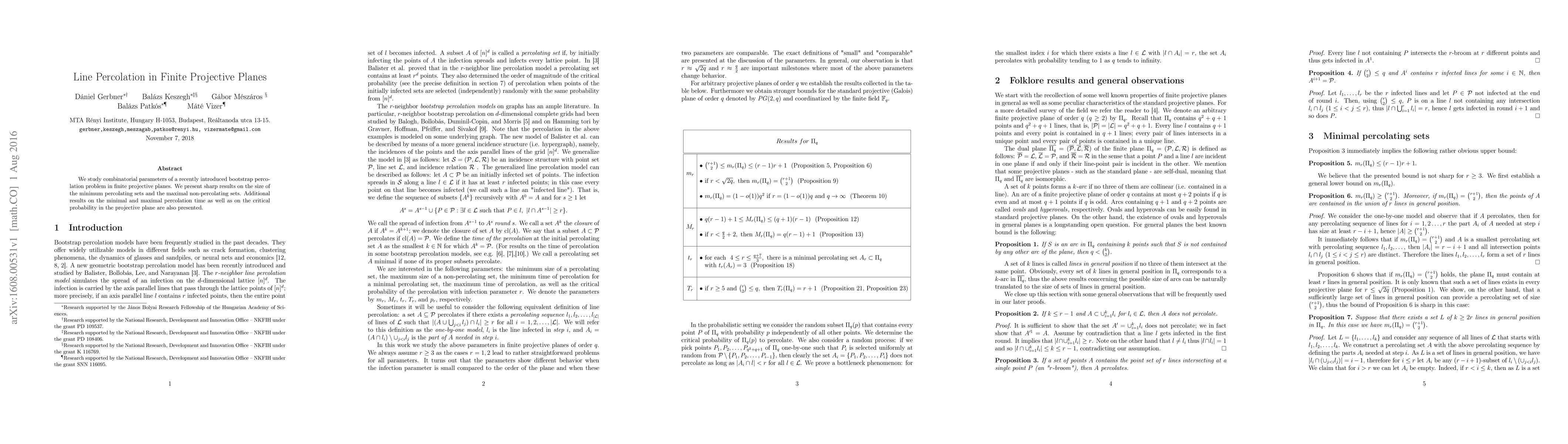 We study combinatorial parameters of a recently introduced bootstrap percolation problem in finite projective planes. We present sharp results on the size of the minimum percolating sets and the maximal non-percolating sets. Additional results on the minimal and maximal percolation time as well as on the critical probability in the projective plane are also presented.