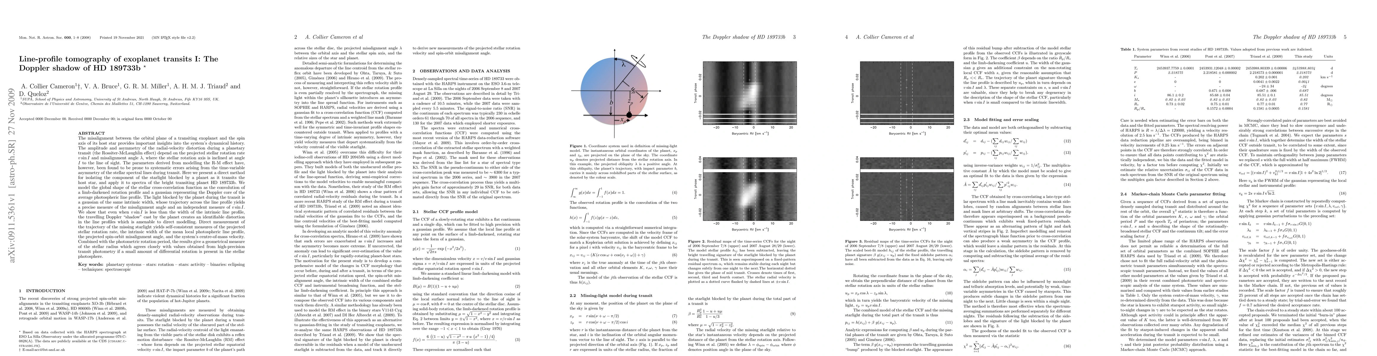 This paper introduces a novel method for isolating the starlight blocked by a transiting exoplanet, applied to HD 189733b. It models the Doppler "shadow" cast by the planet to measure the misalignment angle, v sin I, and the stellar rotation rate, providing a geometrical measure of the stellar radius.