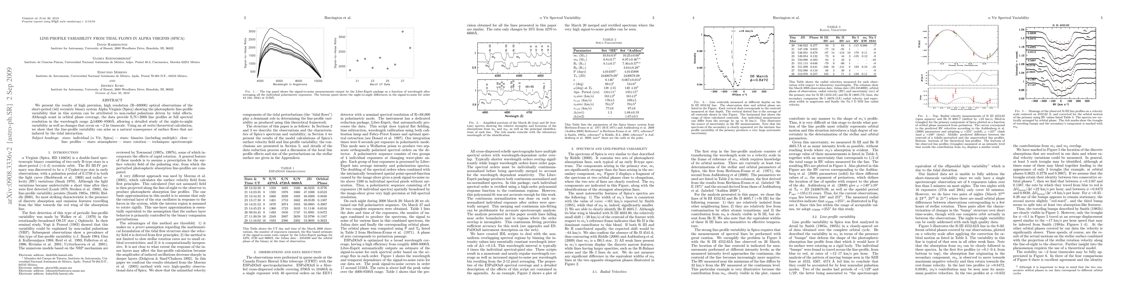 We present the results of high precision, high resolution (R~68000) optical observations of the short-period (4d) eccentric binary system Alpha Virginis (Spica) showing the photospheric line-profile variability that in this system can be attributed to non-radial pulsations driven by tidal effects. Although scant in orbital phase coverage, the data provide S/N>2000 line profiles at full spectral resolution in the wavelength range delta-lambda = 4000--8500 Angstroms, allowing a detailed study of the night-to-night variability as well as changes that occur on ~2 hr timescale. Using an ab initio theoretical calculation, we show that the line-profile variability can arise as a natural consequence of surface flows that are induced by the tidal interaction.