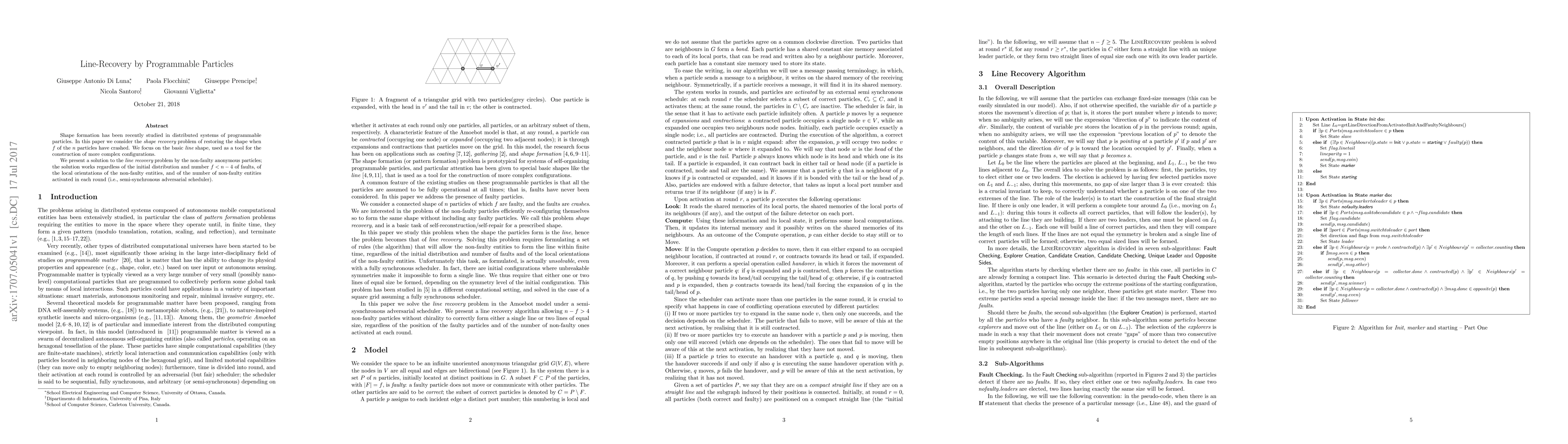 This paper addresses the line recovery problem in distributed systems using programmable particles, presenting a solution that allows non-faulty particles to restore the line shape even when up to $f<n-4$ particles have crashed, regardless of initial distribution, local orientations, and varying activation rounds.