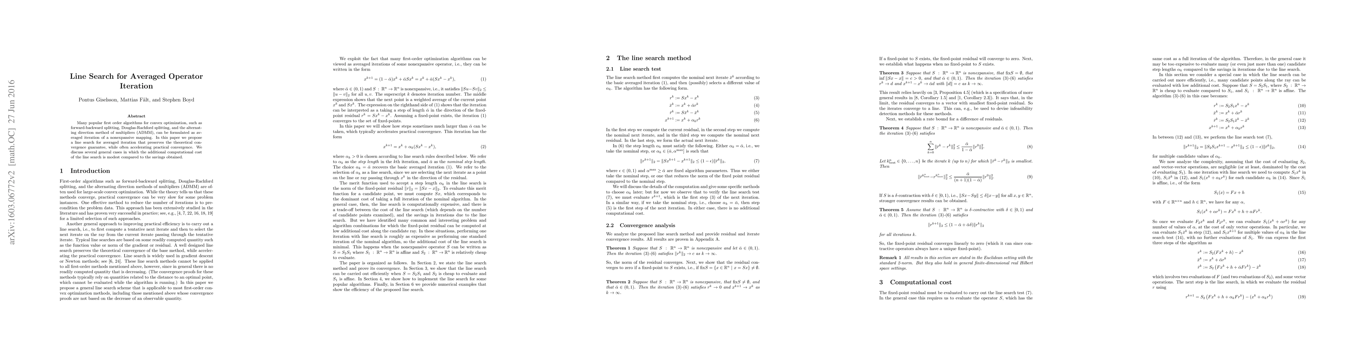 Many popular first order algorithms for convex optimization, such as forward-backward splitting, Douglas-Rachford splitting, and the alternating direction method of multipliers (ADMM), can be formulated as averaged iteration of a nonexpansive mapping. In this paper we propose a line search for averaged iteration that preserves the theoretical convergence guarantee, while often accelerating practical convergence. We discuss several general cases in which the additional computational cost of the line search is modest compared to the savings obtained.