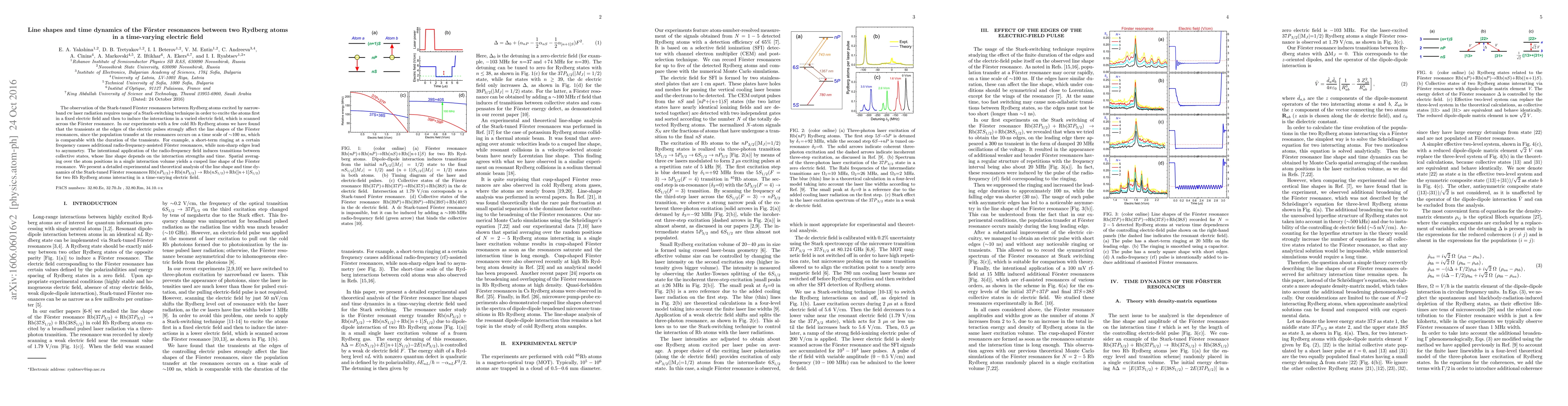 The observation of the Stark-tuned F\"orster resonances between Rydberg atoms excited by narrowband cw laser radiation requires usage of a Stark-switching technique in order to excite the atoms first in a fixed electric field and then to induce the interactions in a varied electric field, which is scanned across the F\"orster resonance. In our experiments with a few cold Rb Rydberg atoms we have found that the transients at the edges of the electric pulses strongly affect the line shapes of the F\"orster resonances, since the population transfer at the resonances occurs on a time scale of $\sim$100 ns, which is comparable with the duration of the transients. For example, a short-term ringing at a certain frequency causes additional radio-frequency-assisted F\"orster resonances, while non-sharp edges lead to asymmetry. The intentional application of the radio-frequency field induces transitions between collective states, whose line shape depends on the interaction strengths and time. Spatial averaging over the atom positions in a single interaction volume yields a cusped line shape of the F\"orster resonance. We present a detailed experimental and theoretical analysis of the line shape and time dynamics of the Stark-tuned F\"orster resonances ${\rm Rb}(nP_{3/2} )+{\rm Rb}(nP_{3/2} )\to {\rm Rb}(nS_{1/2} )+{\rm Rb}([n+1]S_{1/2} )$ for two Rb Rydberg atoms interacting in a time-varying electric field.