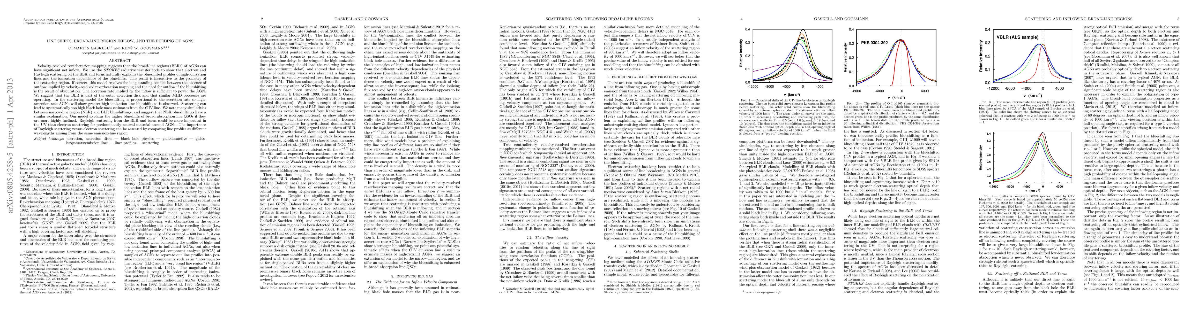Velocity-resolved reverberation mapping suggests that the broad-line regions (BLRs) of AGNs can have significant net inflow. We use the STOKES radiative transfer code to show that electron and Rayleigh scattering off the BLR and torus naturally explains the blueshifted profiles of high-ionization lines and the ionization dependence of the blueshifts. This result is insensitive to the geometry of the scattering region. If correct, this model resolves the long-standing conflict between the absence of outflow implied by velocity-resolved reverberation mapping and the need for outflow if the blueshifting is the result of obscuration. The accretion rate implied by the inflow is sufficient to power the AGN. We suggest that the BLR is part of the outer accretion disk and that similar MHD processes are operating. In the scattering model the blueshifting is proportional to the accretion rate so high-accretion-rate AGNs will show greater high-ionization line blueshifts as is observed. Scattering can lead to systematically too high black hole mass estimates from the C IV line. We note many similarities between narrow-line region (NLR) and BLR blueshiftings, and suggest that NLR blueshiftings have a similar explanation. Our model explains the higher blueshifts of broad absorption line QSOs if they are more highly inclined. Rayleigh scattering from the BLR and torus could be more important in the UV than electron scattering for predominantly neutral material around AGNs. The importance of Rayleigh scattering versus electron scattering can be assessed by comparing line profiles at different wavelengths arising from the same emission-line region.