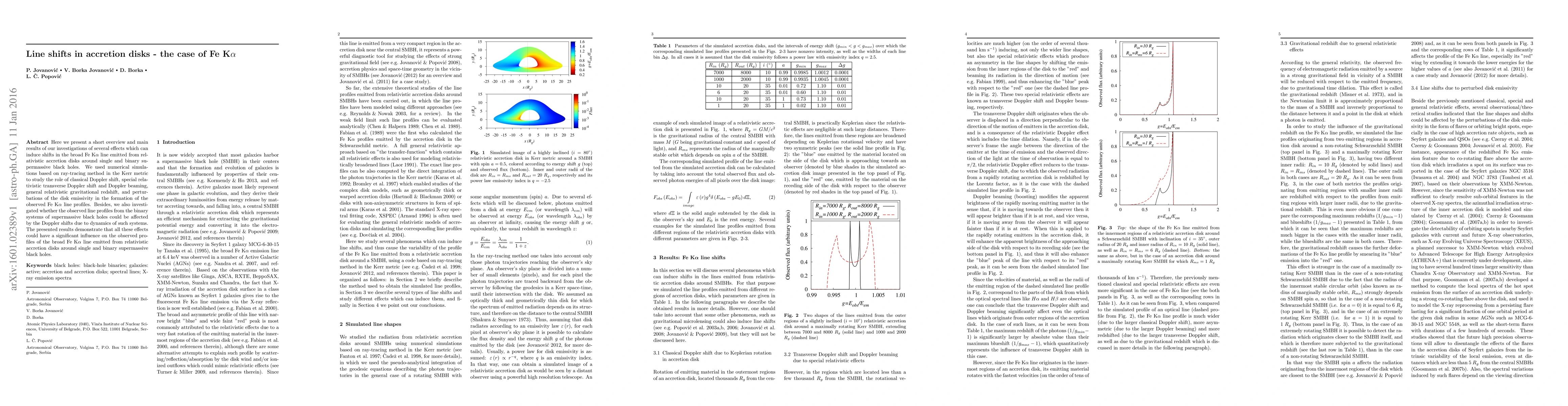 Here we present a short overview and main results of our investigations of several effects which can induce shifts in the broad Fe K$\alpha$ line emitted from relativistic accretion disks around single and binary supermassive black holes. We used numerical simulations based on ray-tracing method in the Kerr metric to study the role of classical Doppler shift, special relativistic transverse Doppler shift and Doppler beaming, general relativistic gravitational redshift, and perturbations of the disk emissivity in the formation of the observed Fe K$\alpha$ line profiles. Besides, we also investigated whether the observed line profiles from the binary systems of supermassive black holes could be affected by the Doppler shifts due to dynamics of such systems. The presented results demonstrate that all these effects could have a significant influence on the observed profiles of the broad Fe K$\alpha$ line emitted from relativistic accretion disks around single and binary supermassive black holes.