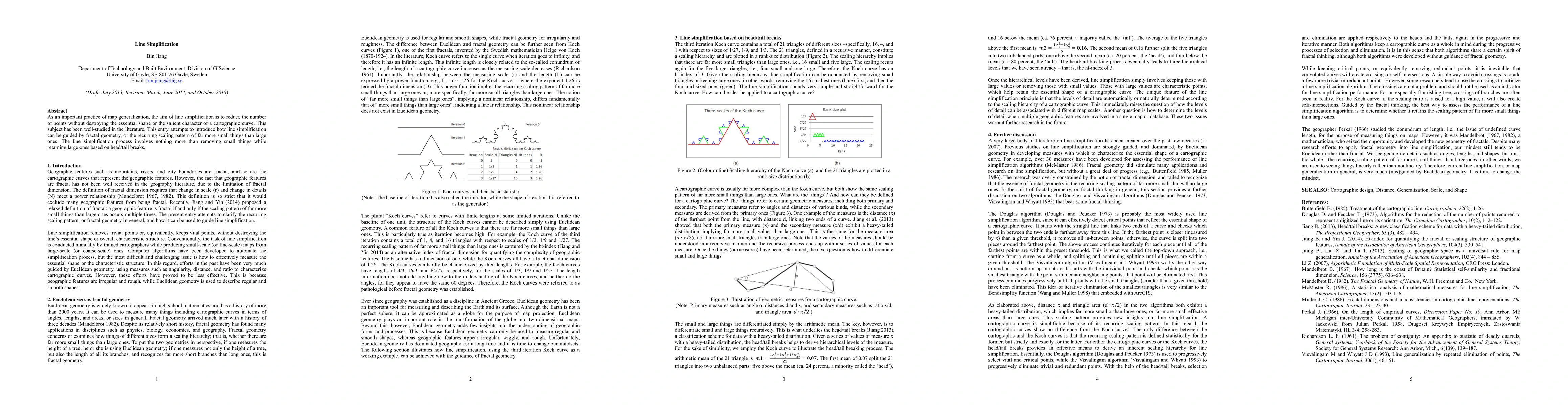 This paper explores line simplification in cartography, guided by fractal geometry. It proposes retaining large-scale features and eliminating small ones based on head/tail breaks, preserving a curve's essential shape.