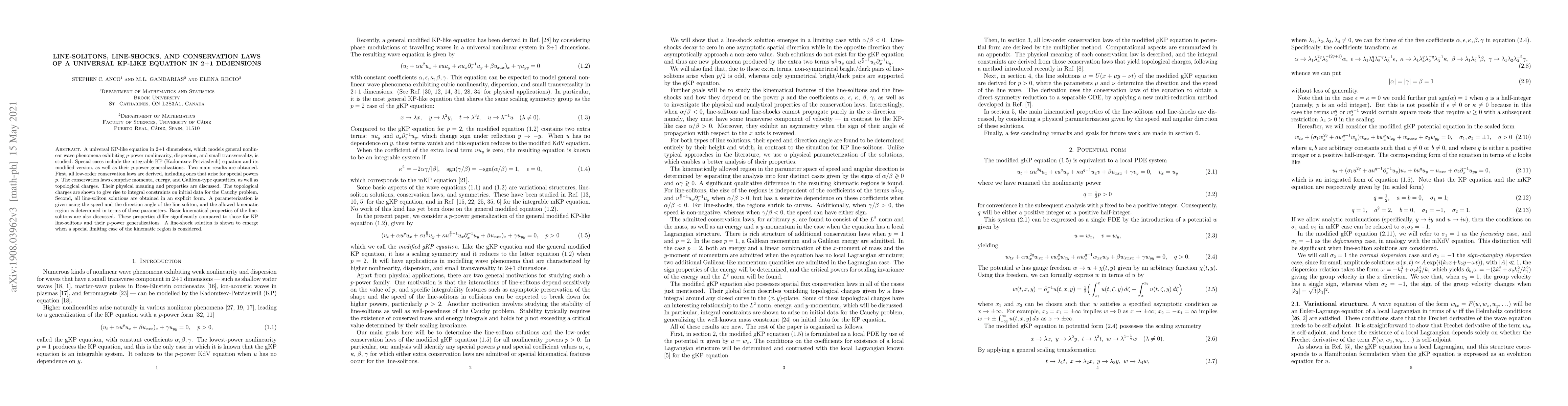 A universal KP-like equation in 2+1 dimensions, which models general nonlinear wave phenomena exhibiting p-power nonlinearity, dispersion, and small transversality, is studied. Special cases include the integrable KP (Kadomtsev-Petviashvili) equation and it is modified version, as well as their p-power generalizations. Two main results are obtained. First, all low-order conservation laws are derived, including ones that arise for special powers p. The conservation laws comprise momenta, energy, and Galilean-type quantities, as well as topological charges. Their physical meaning and properties are discussed. Second, all line-soliton solutions are obtained in an explicit form. A parameterization is given using the speed and the direction angle of the line-soliton, and the allowed kinematic region is determined in terms of these parameters. Basic kinematical properties of the line-solitons are also discussed. These properties differ significantly compared to those for KP line-solitons and their p-power generalizations. A line-shock solution is shown to emerge when a special limiting case of the kinematic region is considered.