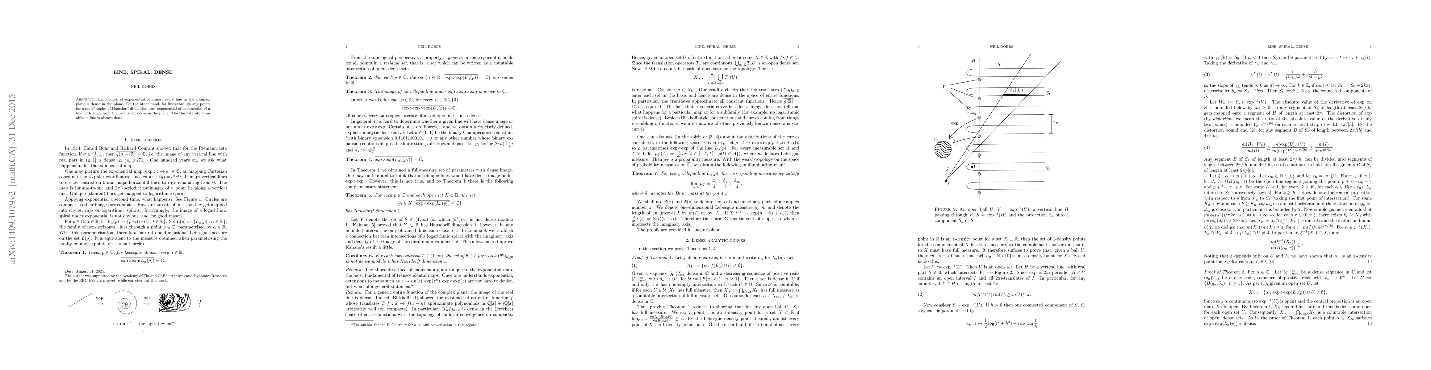 Exponential of exponential of almost every line in the complex plane is dense in the plane. On the other hand, for lines through any point, for a set of angles of Hausdorff dimension one, exponential of exponential of a line with angle from that set is not dense in the plane.