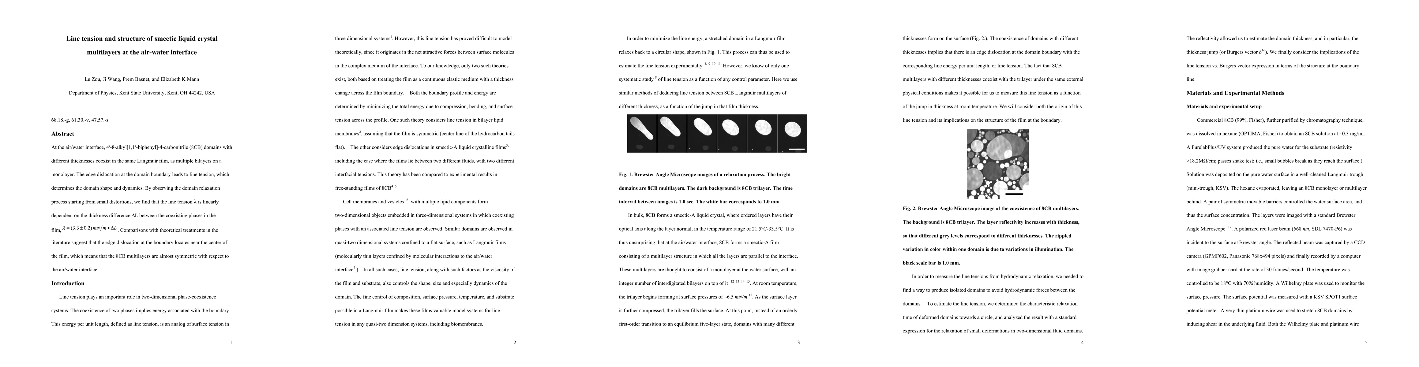 This study investigates the line tension and structure of smectic liquid crystal multilayers at the air-water interface, finding that it is linearly dependent on the thickness difference between coexisting phases. The edge dislocation at domain boundaries is located near the film's center, indicating almost symmetric 8CB multilayers relative to the interface.