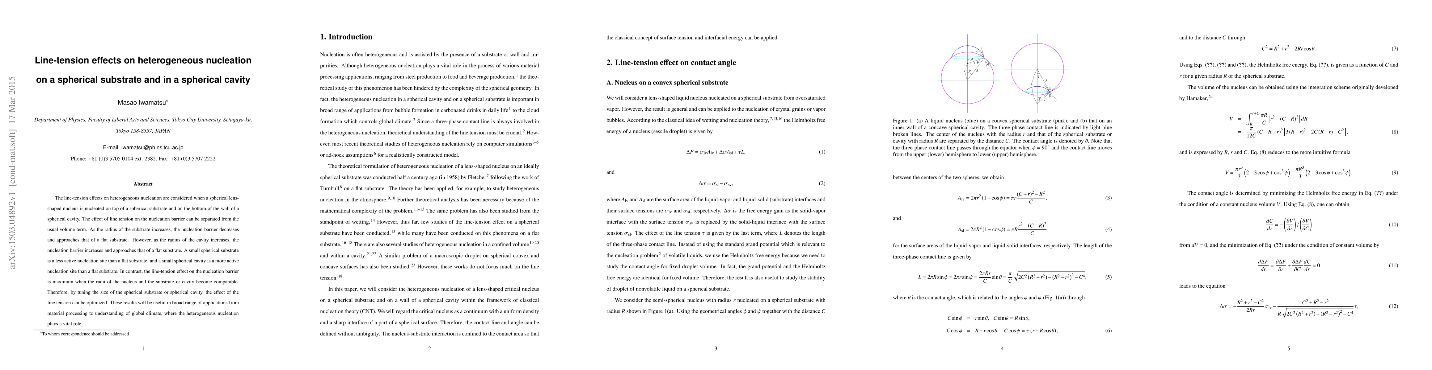 This paper investigates the influence of line tension on heterogeneous nucleation in spherical geometries, showing that smaller spherical substrates lower the nucleation barrier compared to flat substrates, while smaller spherical cavities increase it. Tuning the size of spherical substrates or cavities optimizes line-tension effects on nucleation, with implications for material processing and climate studies.
