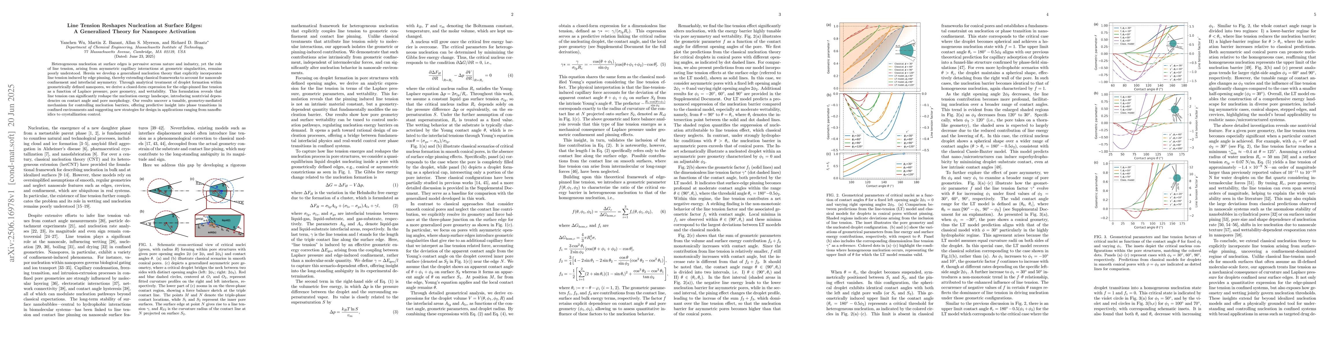 Heterogeneous nucleation at surface edges is pervasive across nature and industry, yet the role of line tension, arising from asymmetric capillary interactions at geometric singularities, remains poorly understood. Herein we develop a generalized nucleation theory that explicitly incorporates line tension induced by edge pinning, thereby extending classical frameworks to account for nanoscale confinement and interfacial asymmetry. Through analytical treatment of droplet formation within geometrically defined nanopores, we derive a closed-form expression for the edge-pinned line tension as a function of Laplace pressure, pore geometry, and wettability. This formulation reveals that line tension can significantly reshape the nucleation energy landscape, introducing nontrivial dependencies on contact angle and pore morphology. Our results uncover a tunable, geometry-mediated mechanism for controlling nucleation barriers, offering predictive insight into phase transitions in confined environments and suggesting new strategies for design in applications ranging from nanofluidics to crystallization control.