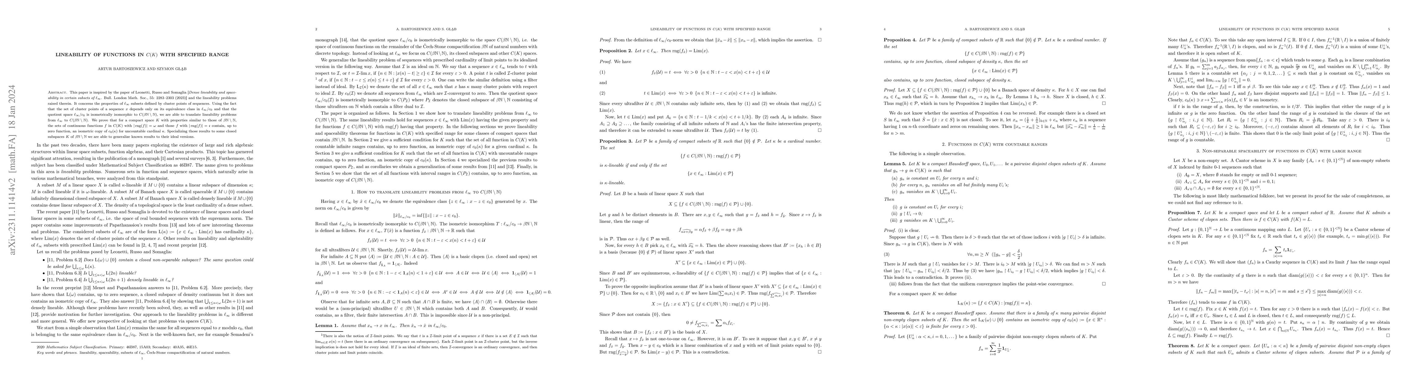 This paper explores the lineability of continuous functions in $C(K)$ with specified ranges, leveraging the properties of $\ell_\infty$ subsets and their equivalence classes. It demonstrates that sets of such functions contain an isometric copy of $c_0(\kappa)$, generalizing known results to closed subspaces of $\beta\mathbb{N}\setminus\mathbb{N}$.