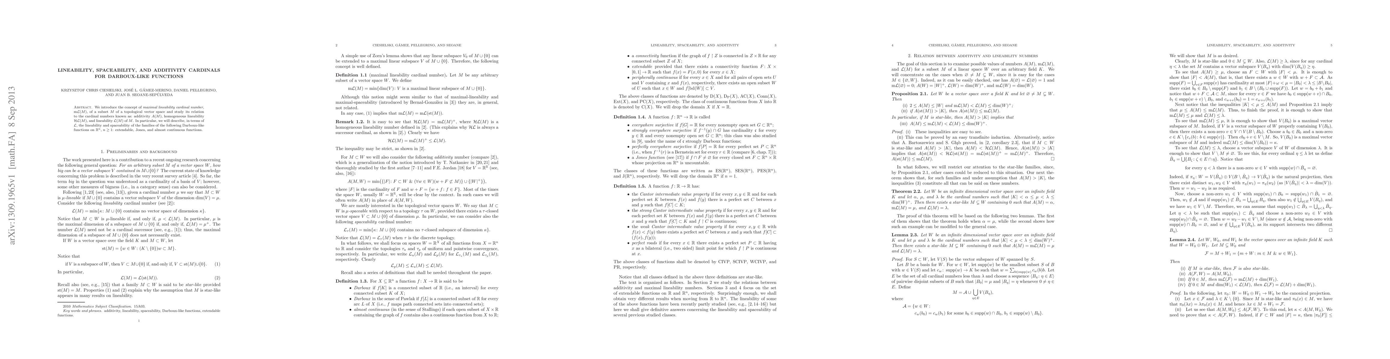 We introduce the concept of {\em maximal lineability cardinal number}, $\mL(M)$, of a subset $M$ of a topological vector space and study its relation to the cardinal numbers known as: additivity $A(M)$, homogeneous lineability $\HL(M)$, and lineability $\LL(M)$ of $M$. In particular, we will describe, in terms of $\LL$, the lineability and spaceability of the families of the following Darboux-like functions on $\real^n$, $n\ge 1$: extendable, Jones, and almost continuous functions.