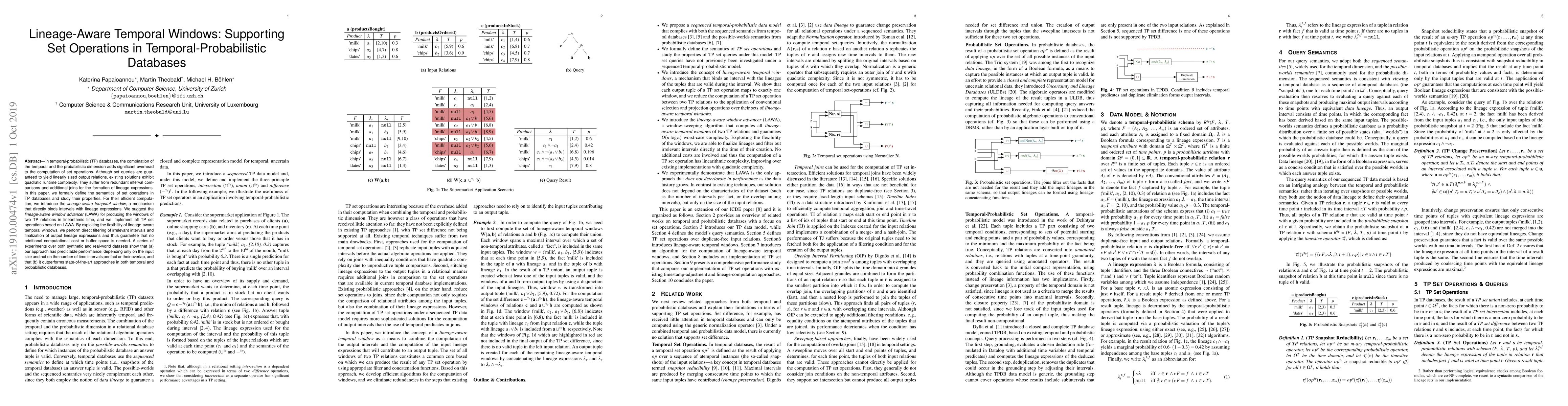 This paper introduces a lineage-aware temporal window mechanism to efficiently compute set operations in temporal-probabilistic databases, achieving linearithmic time complexity and eliminating redundant interval comparisons. The proposed lineage-aware window advancer (LAWA) outperforms existing methods, demonstrating predictable performance and superior efficiency on both synthetic and real-world datasets.