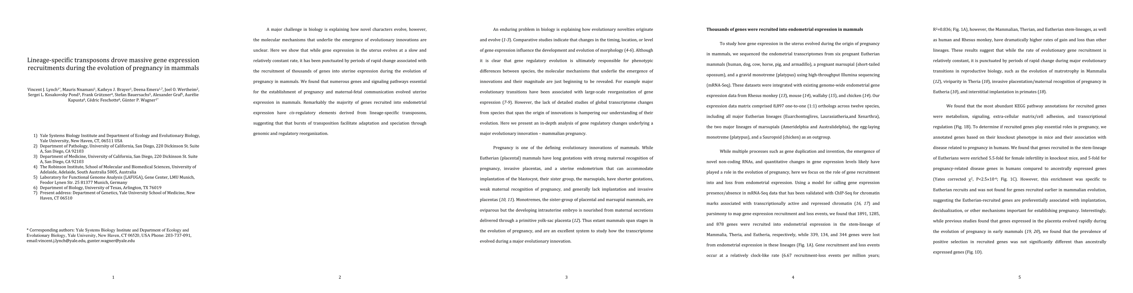This study reveals that the evolution of mammalian pregnancy involves rapid gene expression changes driven by the recruitment of thousands of genes, primarily facilitated by lineage-specific transposons. These transposons provide cis-regulatory elements that enable the adaptation and speciation through genomic reorganization.