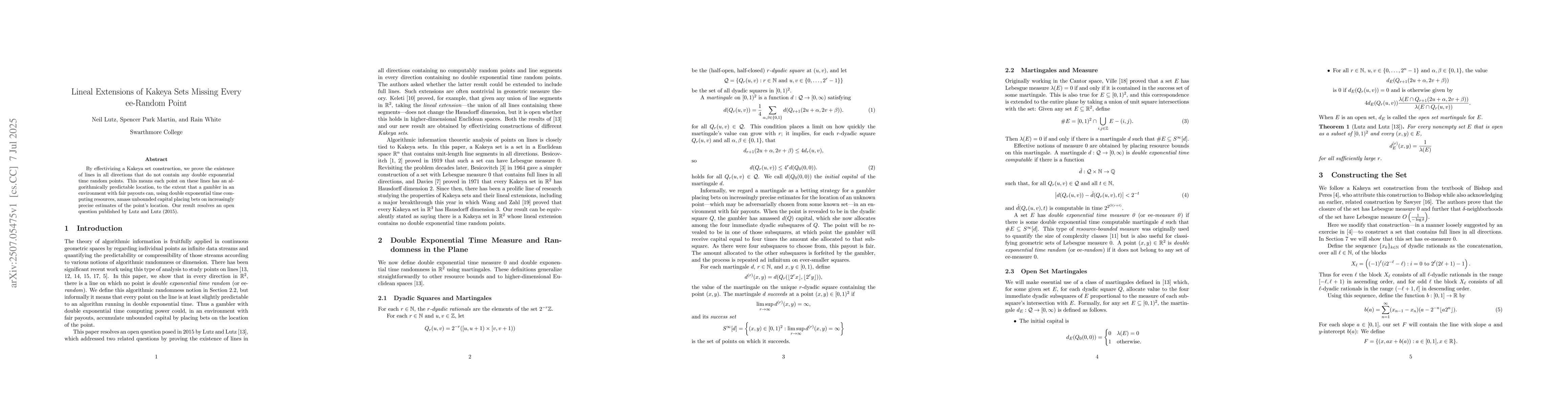 By effectivizing a Kakeya set construction, we prove the existence of lines in all directions that do not contain any double exponential time random points. This means each point on these lines has an algorithmically predictable location, to the extent that a gambler in an environment with fair payouts can, using double exponential time computing resources, amass unbounded capital placing bets on increasingly precise estimates of the point's location. Our result resolves an open question published by Lutz and Lutz (2015).