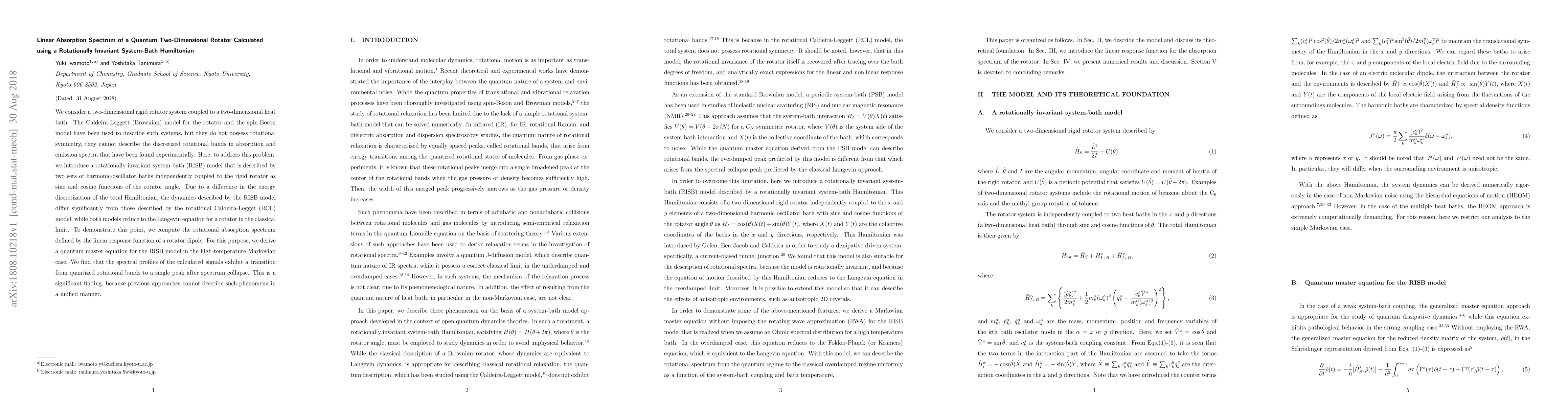 This study introduces a rotationally invariant system-bath model to describe two-dimensional rotator systems coupled to heat baths, predicting the transition from quantized rotational bands to single peaks in absorption spectra at high temperatures.