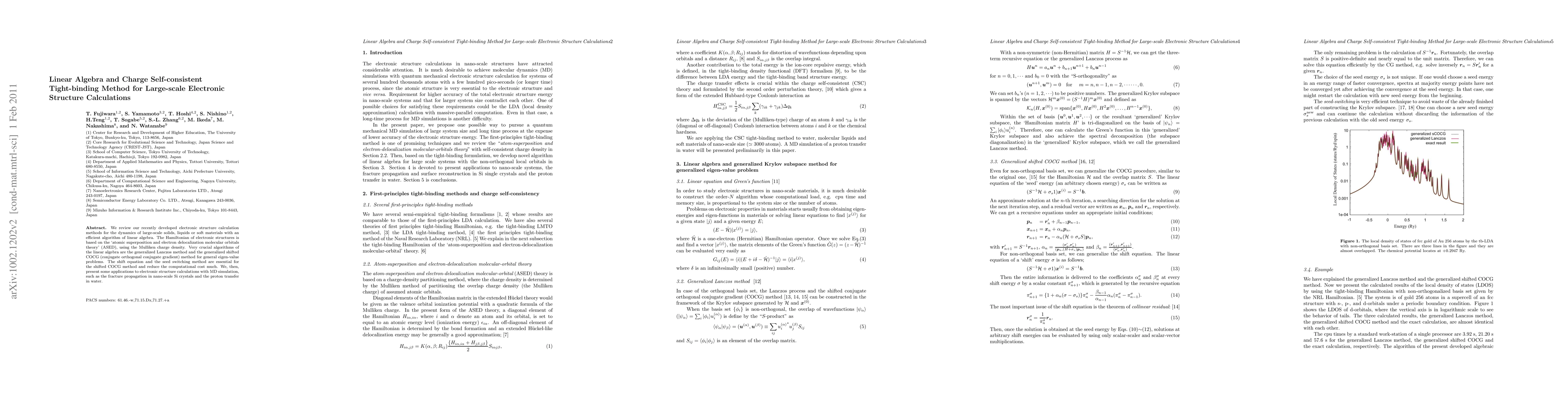 We review our recently developed electronic structure calculation methods used for the dynamics of large-scale solids or liquids with an efficient algorithm for large scale simultaneous linear equations. The electronic structure calculation method is the `atomic superposition and electron delocalization molecular orbitals theory' (ASED), using the Mulliken charge density. Very crucial algorithm is the generalized shifted COCG (conjugate orthogonal conjugate gradient) method based on the Krylov subspace extended to non-orthogonal basis set. The most important techniques for applications are the shifted equation and the seed switching method, which make the computational cost be reduced much. We, then, present some applications to electronic structure calculations with MD simulation. The applications are given to the fracture propagation in nano-scale Si crystals and the proton transfer in water.