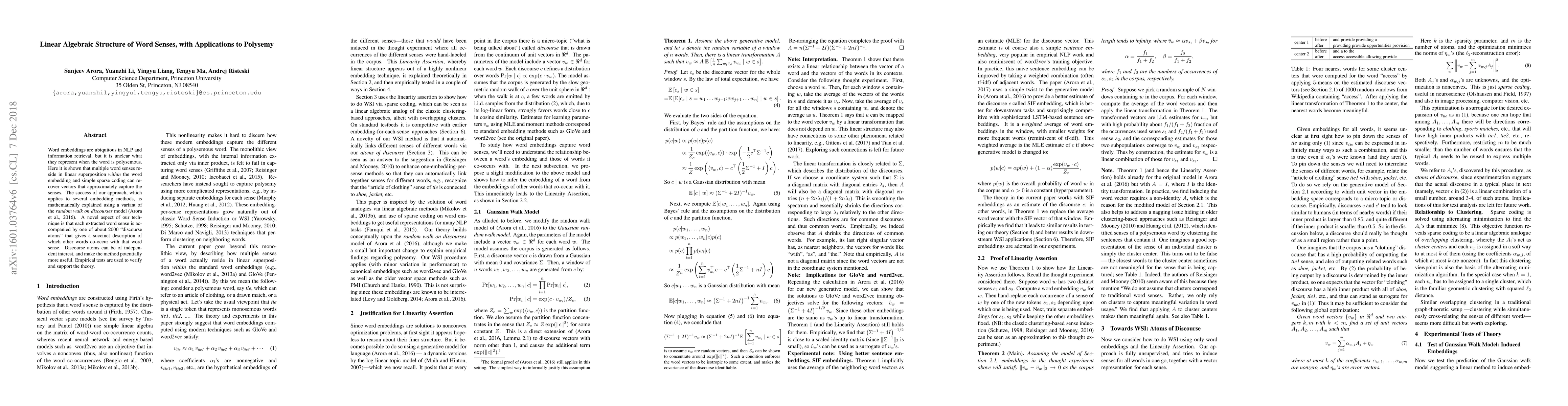 This paper demonstrates that polysemous words in word embeddings exist in linear superposition, and proposes a sparse coding method to recover distinct word senses. The approach is supported by a mathematical explanation using a variant of the random walk on discourses model and is shown to be effective across various embedding techniques.