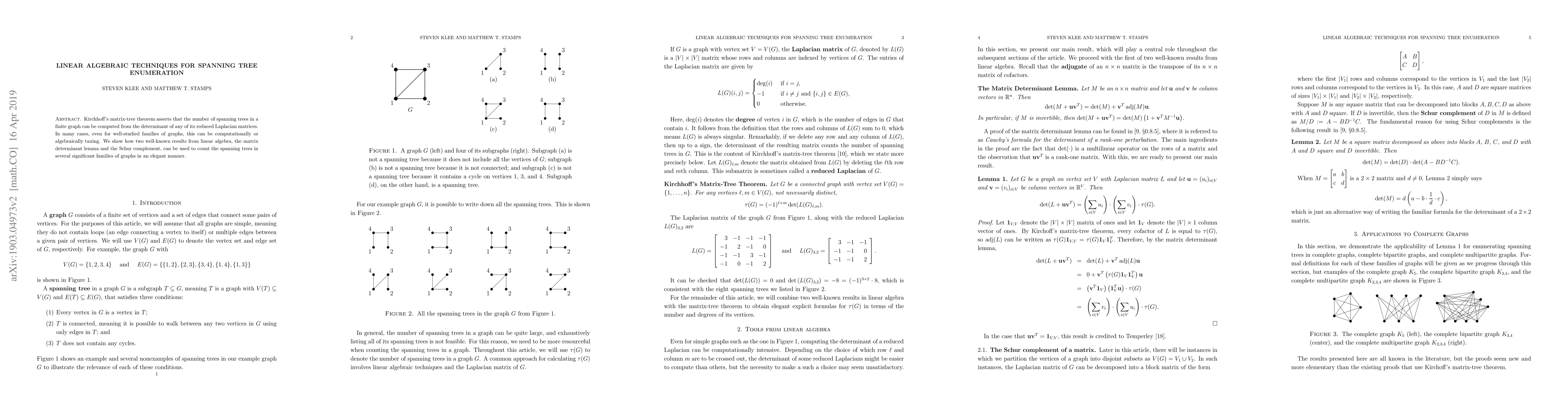 This paper demonstrates how linear algebraic techniques, specifically the Matrix Determinant Lemma and the Schur complement, can simplify the enumeration of spanning trees in various significant graph families, overcoming computational challenges posed by Kirchhoff's Matrix-Tree Theorem.