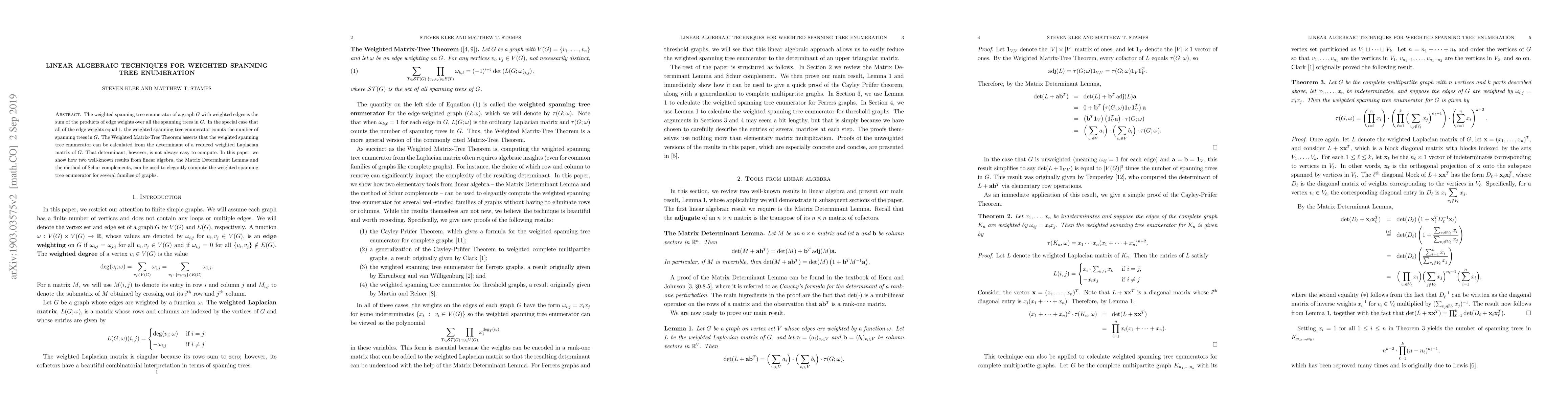This paper explores linear algebraic techniques, specifically the Matrix Determinant Lemma and Schur complements, to efficiently compute the weighted spanning tree enumerator, which sums the products of edge weights over all spanning trees in a graph. It applies these methods to several graph families, offering an elegant solution to the determinant computation challenge.