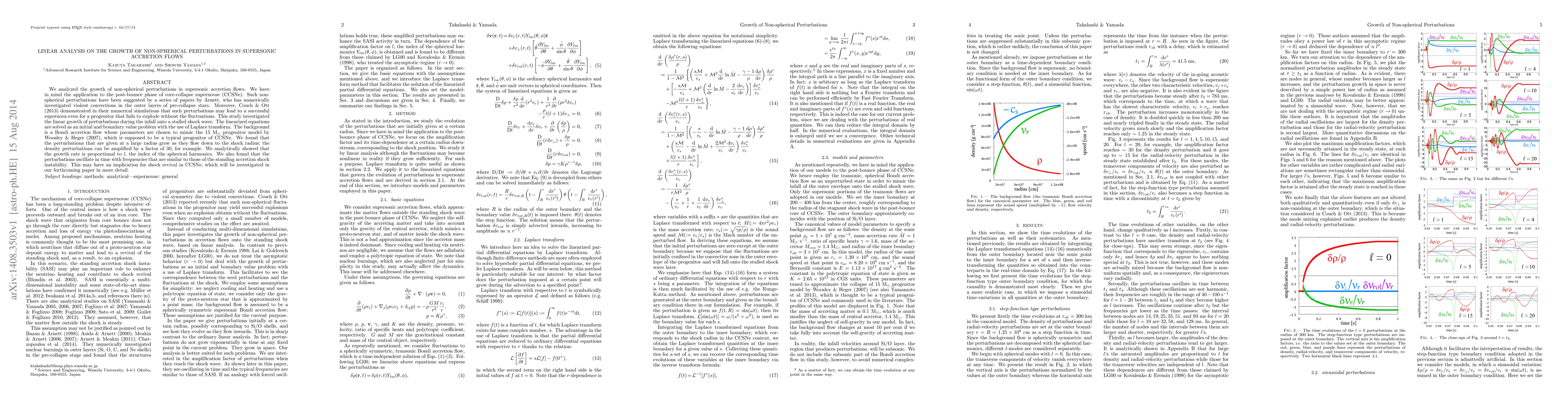 We analyzed the growth of non-spherical perturbations in supersonic accretion flows. We have in mind the application to the post-bounce phase of core-collapse supernovae (CCSNe). Such non-spherical perturbations have been suggested by a series of papers by Arnett, who has numerically investigated violent convections in the outer layers of pre-collapse stars. Moreover, Couch & Ott (2013) demonstrated in their numerical simulations that such perturbations may lead to a successful supernova even for a progenitor that fails to explode without the fluctuations. This study investigated the linear growth of perturbations during the infall onto a stalled shock wave. The linearized equations are solved as an initial and boundary value problem with the use of Laplace transform. The background is a Bondi accretion flow whose parameters are chosen to mimic the 15 $\mathrm{M_\odot}$ progenitor model by Woosley & Heger (2007), which is supposed to be a typical progenitor of CCSNe. We found that the perturbations that are given at a large radius grow as they flow down to the shock radius; the density perturbations can be amplified by a factor of 30, for example. We analytically showed that the growth rate is proportional to $l$, the index of the spherical harmonics. We also found that the perturbations oscillate in time with frequencies that are similar to those of the standing accretion shock instability. This may have an implication for shock revival in CCSNe, which will be investigated in our forthcoming paper in more detail.