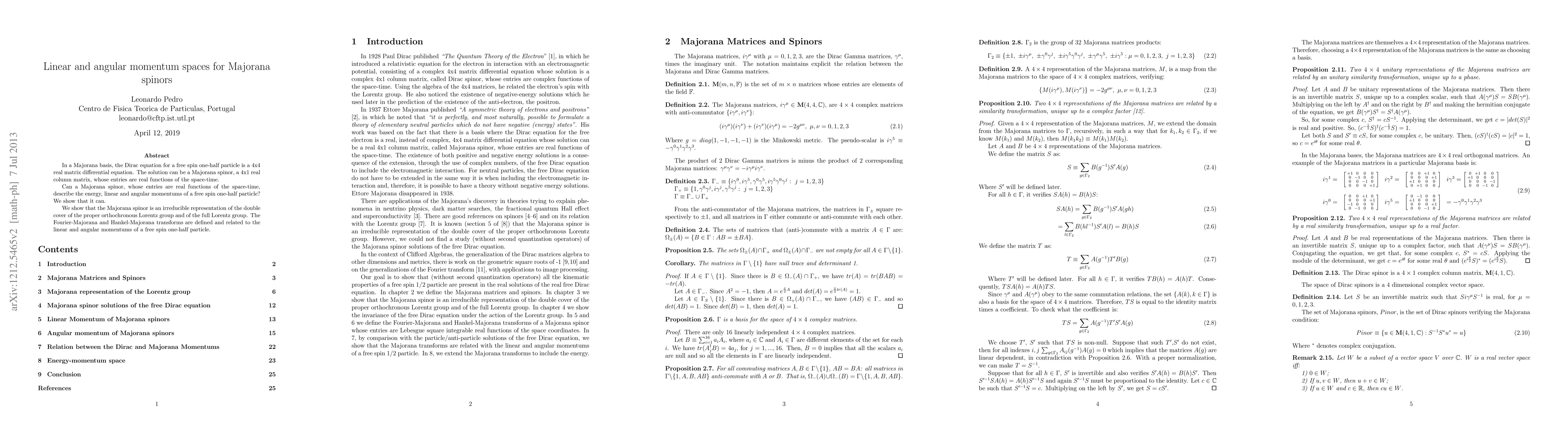 In a Majorana basis, the Dirac equation for a free spin one-half particle is a 4x4 real matrix differential equation. The solution can be a Majorana spinor, a 4x1 real column matrix, whose entries are real functions of the space-time. Can a Majorana spinor, whose entries are real functions of the space-time, describe the energy, linear and angular momentums of a free spin one-half particle? We show that it can. We show that the Majorana spinor is an irreducible representation of the double cover of the proper orthochronous Lorentz group and of the full Lorentz group. The Fourier-Majorana and Hankel-Majorana transforms are defined and related to the linear and angular momentums of a free spin one-half particle.