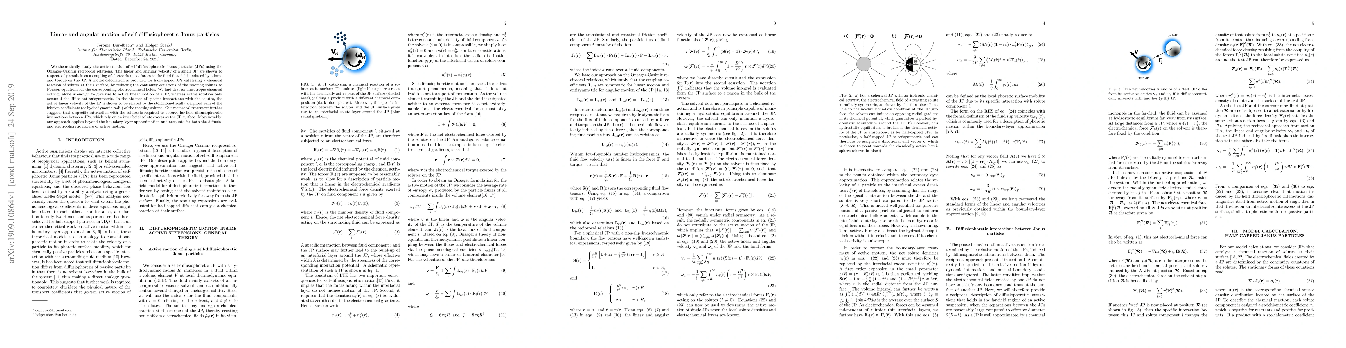 This paper theoretically investigates the self-diffusiophoretic motion of Janus particles, showing that linear motion arises from anisotropic chemical activity, while angular motion requires non-axisymmetry. The study extends beyond boundary-layer approximations to encompass both diffusio- and electrophoretic effects.