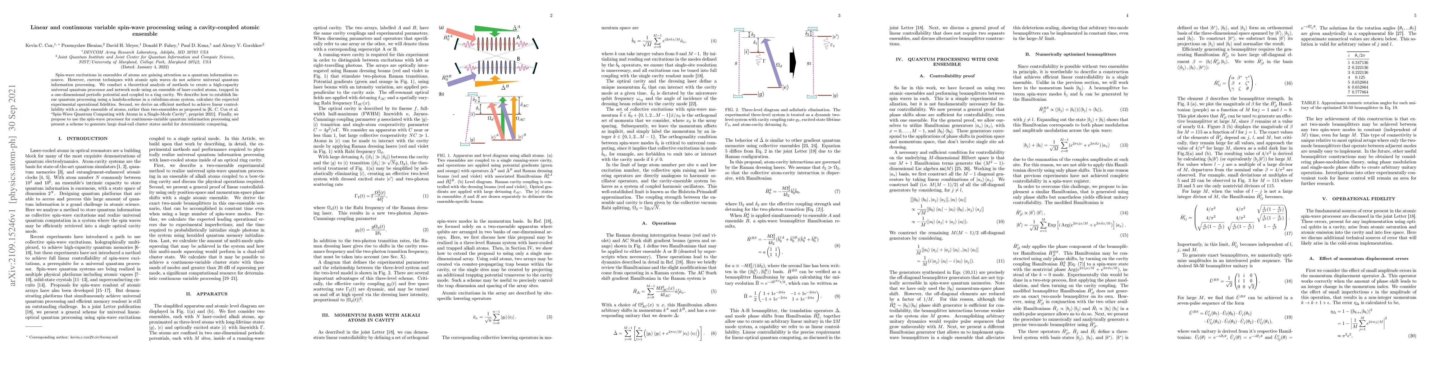 Spin-wave excitations in ensembles of atoms are gaining attention as a quantum information resource. However, current techniques with atomic spin waves do not achieve universal quantum information processing. We conduct a theoretical analysis of methods to create a high-capacity universal quantum processor and network node using an ensemble of laser-cooled atoms, trapped in a one-dimensional periodic potential and coupled to a ring cavity. We describe how to establish linear quantum processing using a lambda-scheme in a rubidium-atom system, calculate the expected experimental operational fidelities. Second, we derive an efficient method to achieve linear controllability with a single ensemble of atoms, rather than two-ensembles as proposed in [K. C. Cox et al. Spin-Wave Quantum Computing with Atoms in a Single-Mode Cavity, preprint 2021]. Finally, we propose to use the spin-wave processor for continuous-variable quantum information processing and present a scheme to generate large dual-rail cluster states useful for deterministic computing.