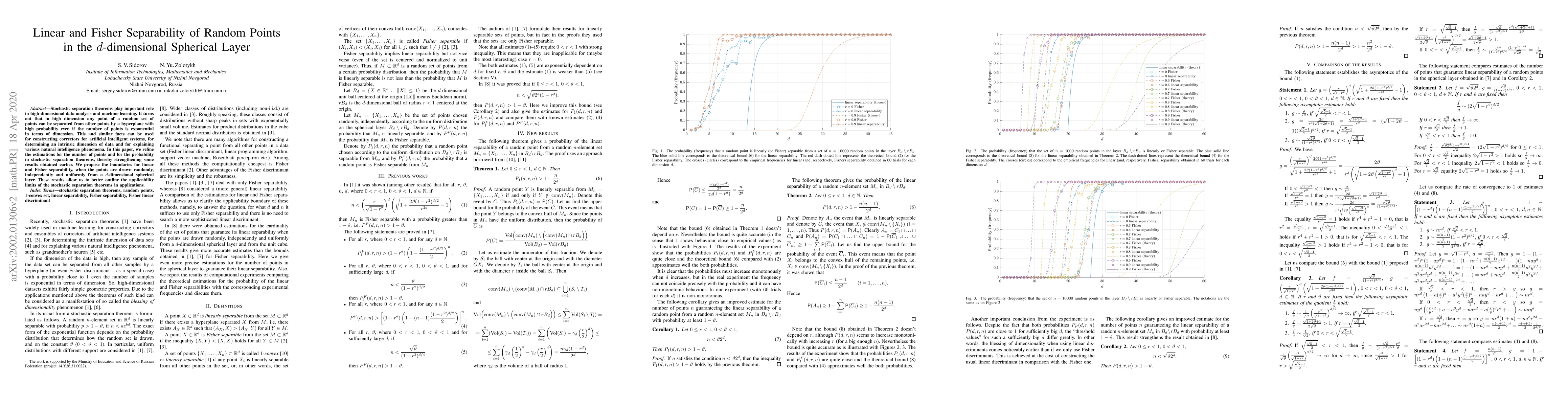 Stochastic separation theorems play important role in high-dimensional data analysis and machine learning. It turns out that in high dimension any point of a random set of points can be separated from other points by a hyperplane with high probability even if the number of points is exponential in terms of dimension. This and similar facts can be used for constructing correctors for artificial intelligent systems, for determining an intrinsic dimension of data and for explaining various natural intelligence phenomena. In this paper, we refine the estimations for the number of points and for the probability in stochastic separation theorems, thereby strengthening some results obtained earlier. We propose the boundaries for linear and Fisher separability, when the points are drawn randomly, independently and uniformly from a $d$-dimensional spherical layer. These results allow us to better outline the applicability limits of the stochastic separation theorems in applications.