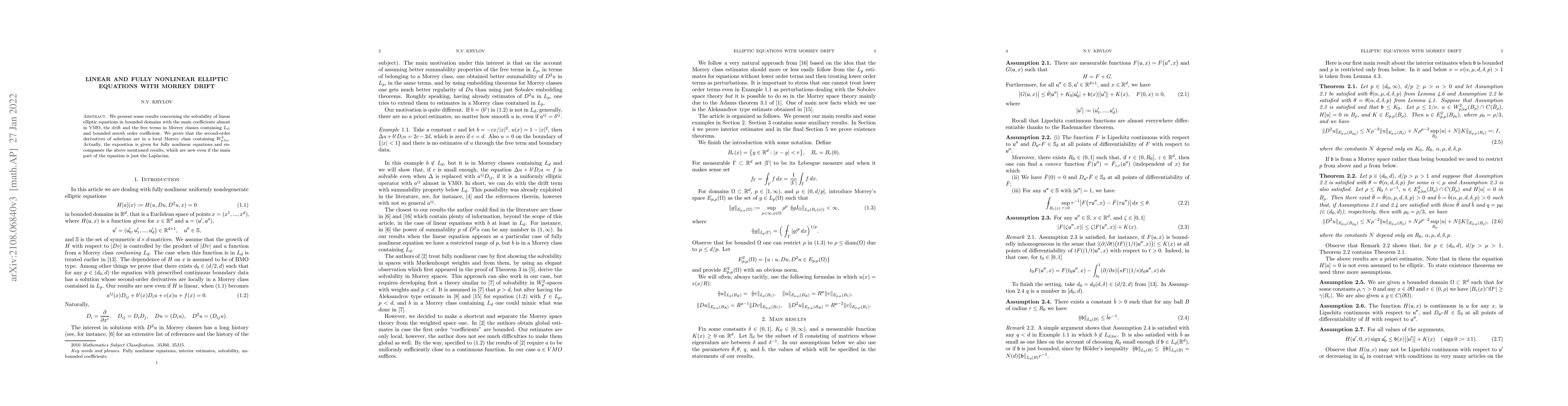 This paper investigates the solvability of linear and fully nonlinear elliptic equations in bounded domains with coefficients almost in VMO and drift terms in Morrey classes. It proves that solutions have second-order derivatives in a local Morrey class containing $W^{2}_{p,loc}$.