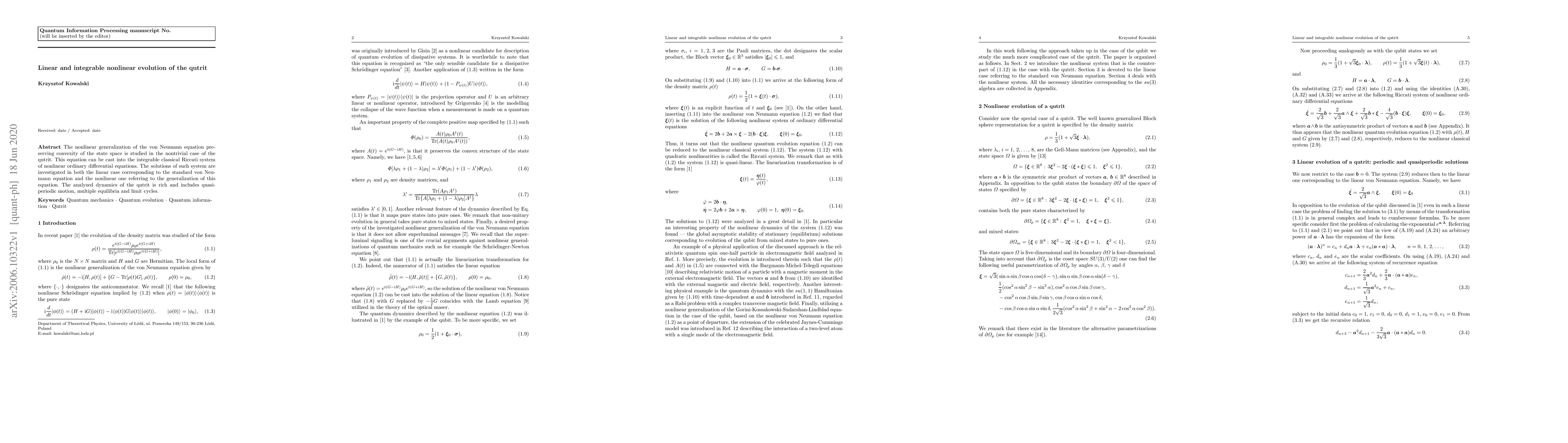 The nonlinear generalization of the von Neumann equation preserving convexity of the state space is studied in the nontrivial case of the qutrit. This equation can be cast into the integrable classical Riccati system of nonlinear ordinary differential equations. The solutions of such system are investigated in both the linear case corresponding to the standard von Neumann equation and the nonlinear one referring to the generalization of this equation. The analyzed dynamics of the qutrit is rich and includes quasiperiodic motion, multiple equilibria and limit cycles.
