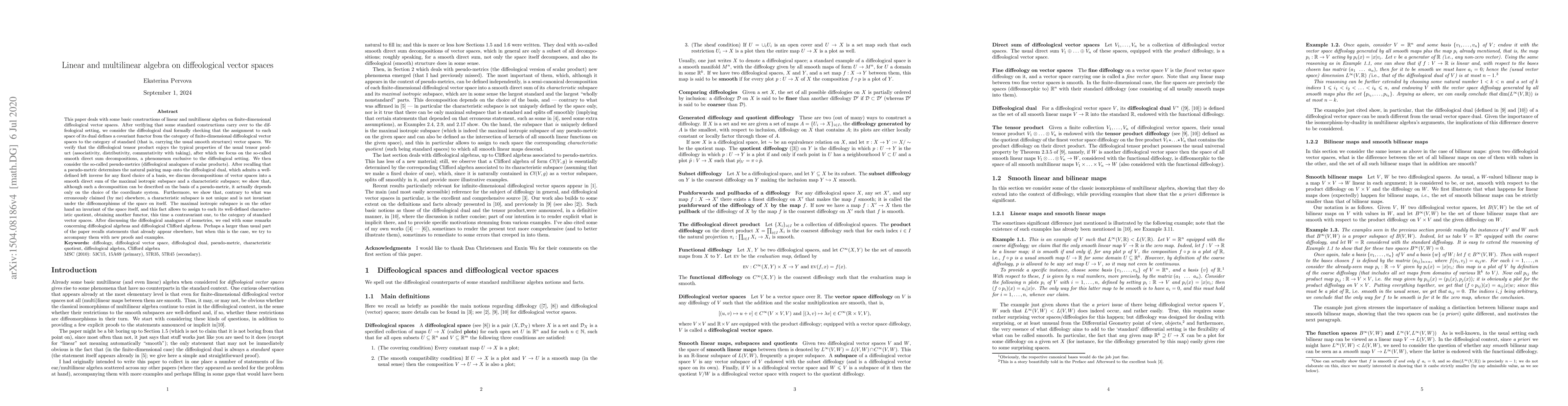 This paper explores linear and multilinear algebra on finite-dimensional diffeological vector spaces, constructing the diffeological dual and tensor product, and investigating smooth direct sum decompositions and pseudo-metrics. It clarifies the non-uniqueness and non-invariance of characteristic subspaces and establishes the well-definedness of the characteristic quotient as a contravariant functor.