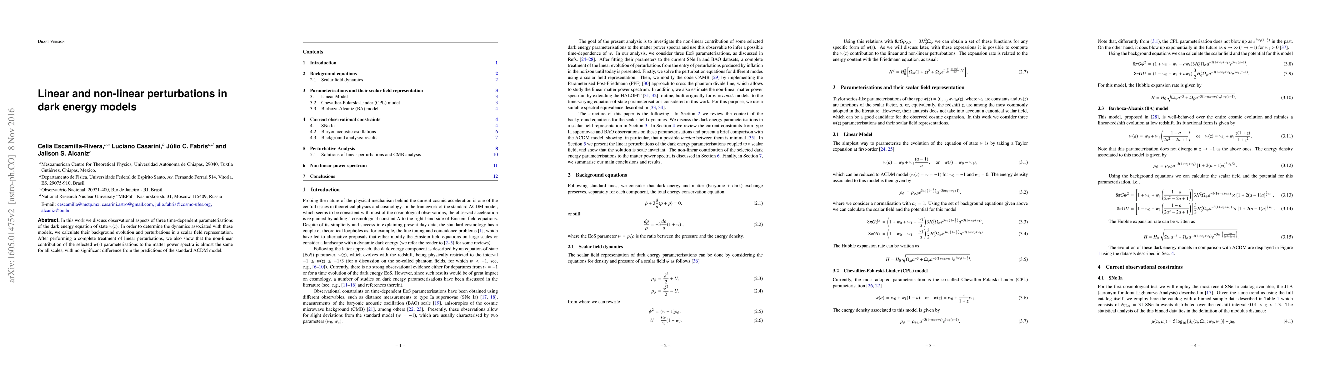 In this work we discuss observational aspects of three time-dependent parameterisations of the dark energy equation of state $w(z)$. In order to determine the dynamics associated with these models, we calculate their background evolution and perturbations in a scalar field representation. After performing a complete treatment of linear perturbations, we also show that the non-linear contribution of the selected $w(z)$ parameterisations to the matter power spectra is almost the same for all scales, with no significant difference from the predictions of the standard $\Lambda$CDM model.