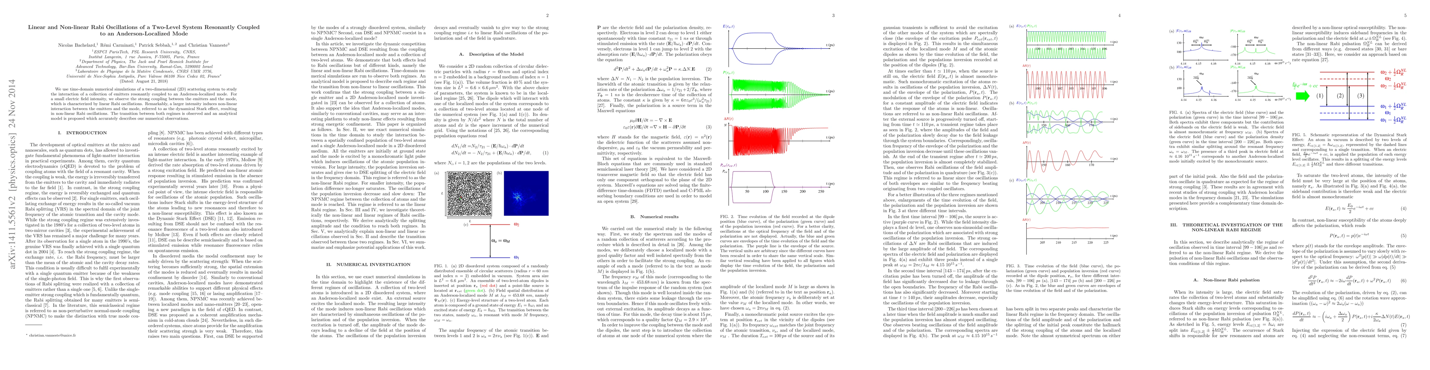 This paper investigates the interaction between emitters and an Anderson-localized mode in a 2D scattering system, observing linear Rabi oscillations at low electric field intensities and non-linear Rabi oscillations at higher intensities due to the dynamical Stark effect. An analytical model is proposed to describe the transition between these regimes.