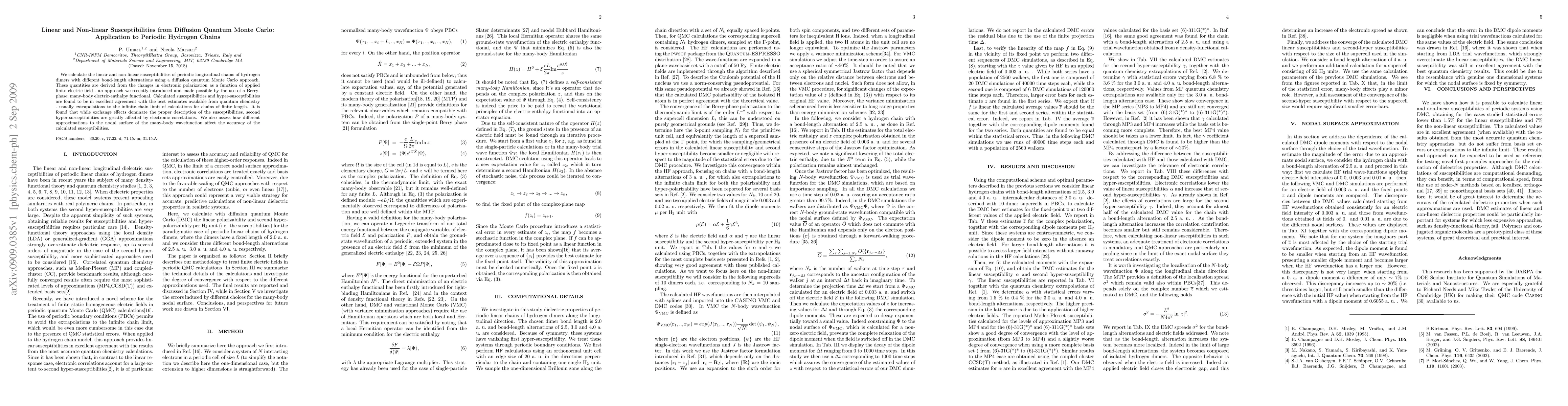 We calculate the linear and non-linear susceptibilities of periodic longitudinal chains of hydrogen dimers with different bond-length alternations using a diffusion quantum Monte Carlo approach. These quantities are derived from the changes in electronic polarization as a function of applied finite electric field - an approach we recently introduced and made possible by the use of a Berry-phase, many-body electric-enthalpy functional. Calculated susceptibilities and hyper-susceptibilities are found to be in excellent agreement with the best estimates available from quantum chemistry - usually extrapolations to the infinite-chain limit of calculations for chains of finite length. It is found that while exchange effects dominate the proper description of the susceptibilities, second hyper-susceptibilities are greatly affected by electronic correlations. We also assess how different approximations to the nodal surface of the many-body wavefunction affect the accuracy of the calculated susceptibilities.