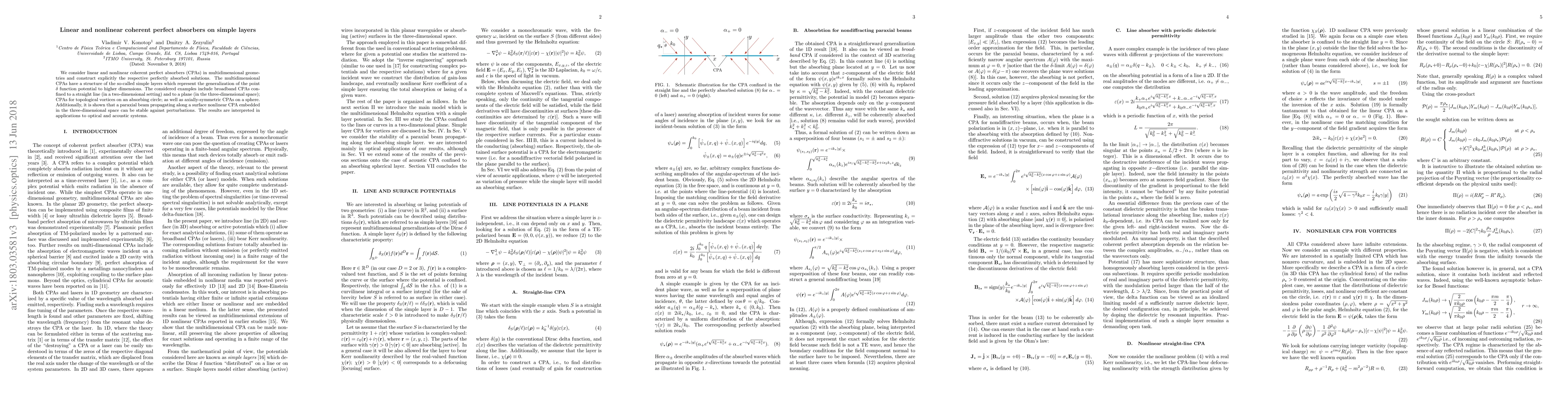 The paper explores linear and nonlinear coherent perfect absorbers (CPAs) in multidimensional spaces, constructing explicit solutions for them. These CPAs, structured as 'simple layers', include examples like broadband CPAs on lines or planes, vortex CPAs on circles, and spherical CPAs. The study also reveals that paraxial beams on surface nonlinear CPAs in 3D can be stable under perturbations, with implications for optical and acoustic systems.