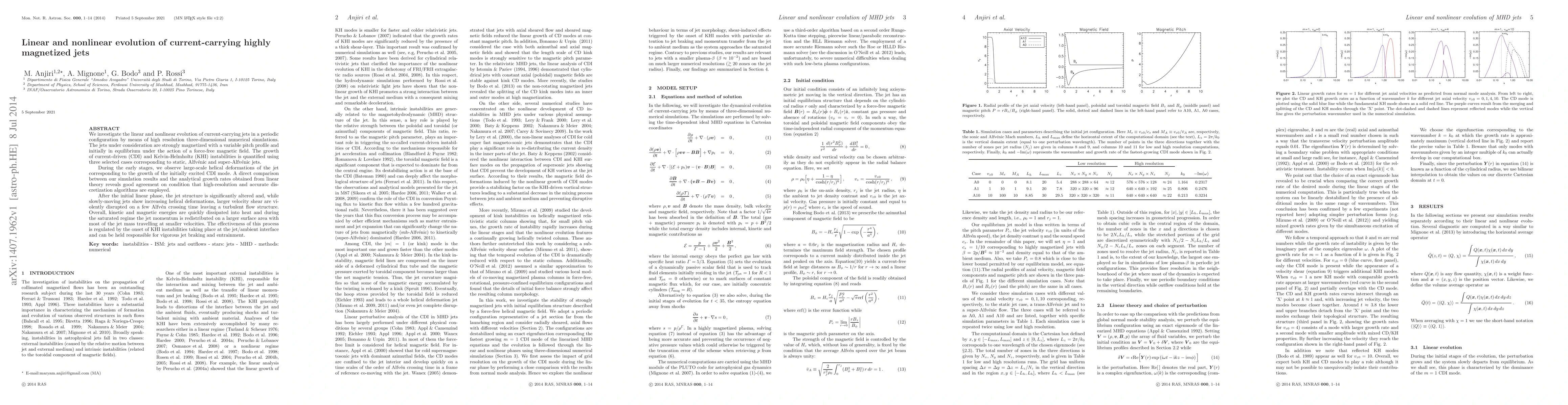 We investigate the linear and nonlinear evolution of current-carrying jets in a periodic configuration by means of high resolution three-dimensional numerical simulations. The jets under consideration are strongly magnetized with a variable pitch profile and initially in equilibrium under the action of a force-free magnetic field. The growth of current-driven (CDI) and Kelvin-Helmholtz (KHI) instabilities is quantified using three selected cases corresponding to static, Alfvenic and super-Alfvenic jets. During the early stages, we observe large-scale helical deformations of the jet corresponding to the growth of the initially excited CDI mode. A direct comparison between our simulation results and the analytical growth rates obtained from linear theory reveals good agreement on condition that high-resolution and accurate discretization algorithms are employed. After the initial linear phase, the jet structure is significantly altered and, while slowly-moving jets show increasing helical deformations, larger velocity shear are violently disrupted on a few Alfven crossing time leaving a turbulent flow structure. Overall, kinetic and magnetic energies are quickly dissipated into heat and during the saturated regime the jet momentum is redistributed on a larger surface area with most of the jet mass travelling at smaller velocities. The effectiveness of this process is regulated by the onset of KHI instabilities taking place at the jet/ambient interface and can be held responsible for vigorous jet braking and entrainment.