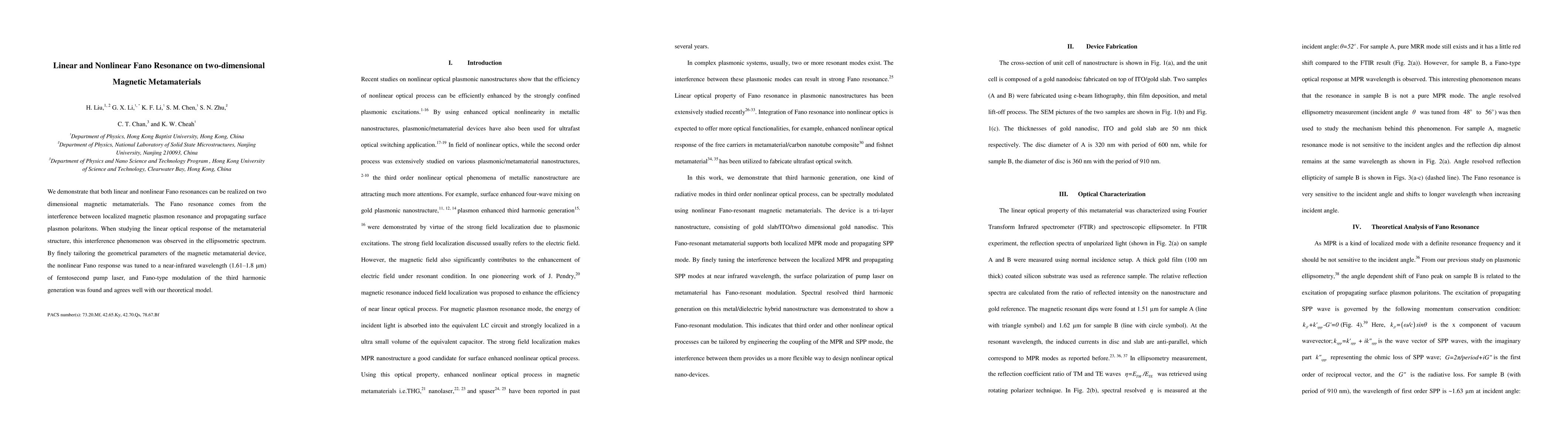 This paper demonstrates linear and nonlinear Fano resonances in two-dimensional magnetic metamaterials, resulting from interference between localized magnetic plasmon resonance and propagating surface plasmon polaritons. Nonlinear Fano response was tuned to near-infrared wavelengths and correlated with third harmonic generation, corroborated by theoretical modeling.