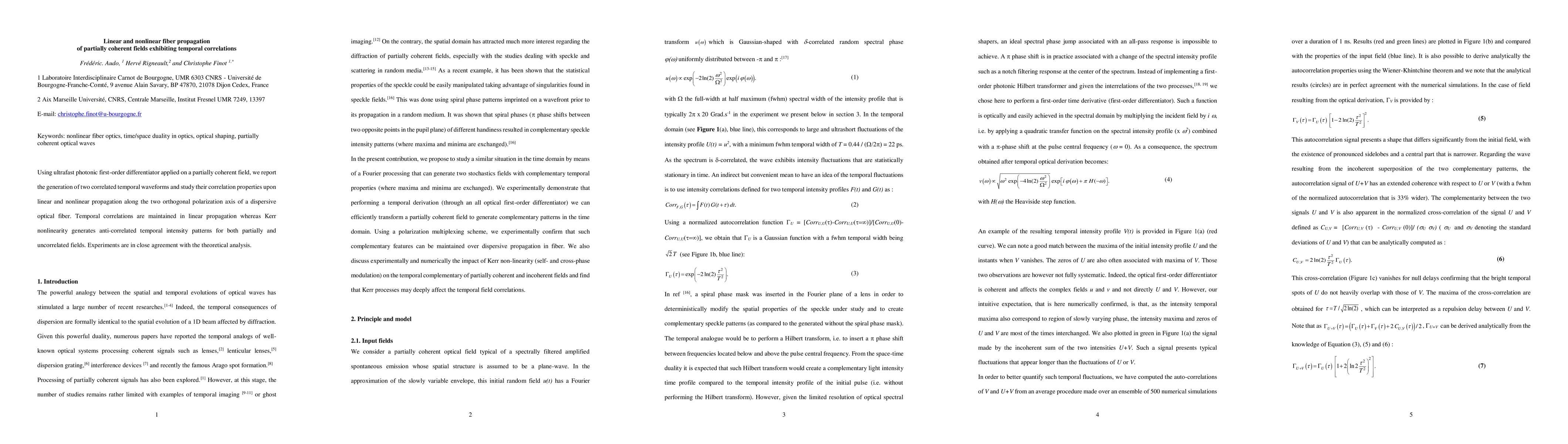 This paper investigates the propagation of partially coherent fields through an optical fiber, demonstrating the generation of correlated temporal waveforms and their behavior under linear and nonlinear conditions. It finds that temporal correlations persist in linear propagation but are altered by Kerr nonlinearity, generating anti-correlated patterns.