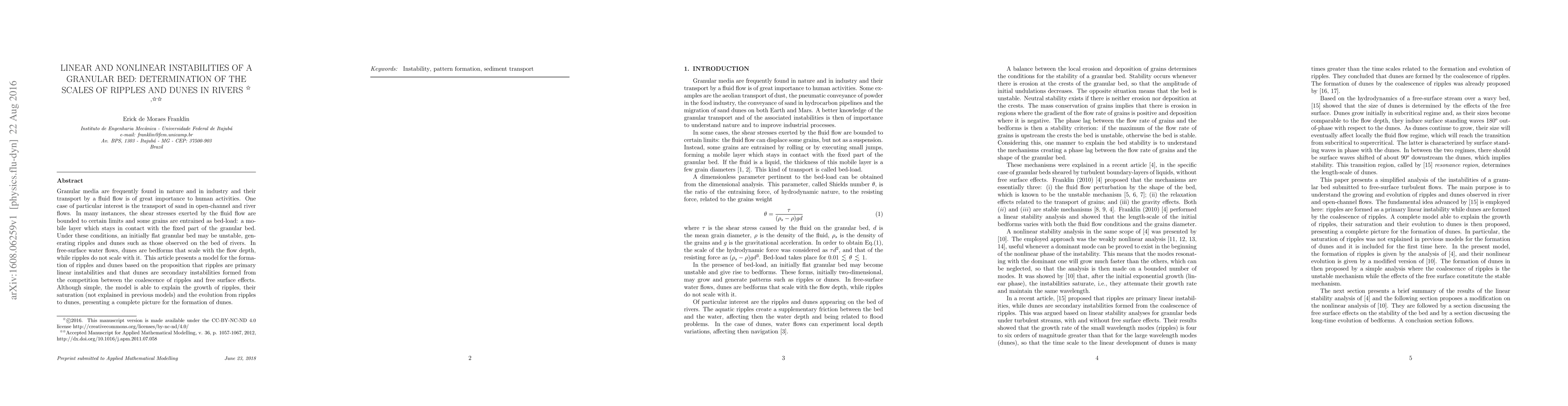Researchers developed a model to explain how ripples and dunes form in rivers, finding that ripples are primary linear instabilities while dunes emerge from the competition between ripple coalescence and surface effects.