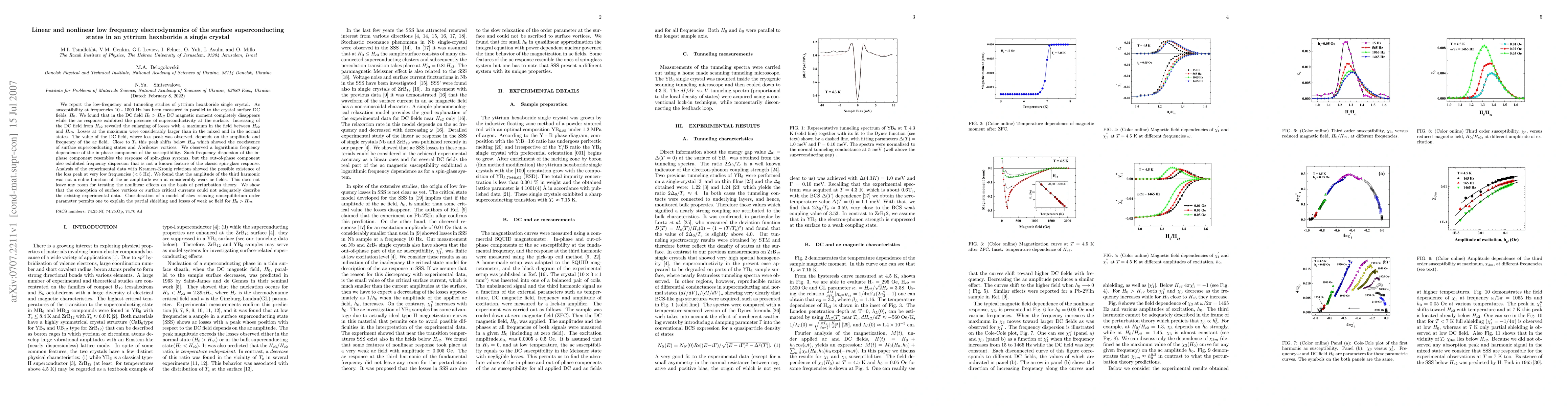 We report the low-frequency and tunneling studies of yttrium hexaboride single crystal. Ac susceptibility at frequencies 10 - 1500 Hz has been measured in parallel to the crystal surface DC felds, H0. We found that in the DC feld H0 > Hc2 DC magnetic moment completely disappears while the ac response exhibited the presence of superconductivity at the surface. Increasing of the DC field from Hc2 revealed the enlarging of losses with a maximum in the feld between Hc2 and Hc3. Losses at the maximum were considerably larger than in the mixed and in the normal states. The value of the DC field, where loss peak was observed, depends on the amplitude and frequency of the ac feld. Close to Tc this peak shifts below Hc2 which showed the coexistence of surface superconducting states and Abrikosov vortices. We observed a logarithmic frequency dependence of the in-phase component of the susceptibility. Such frequency dispersion of the inphase component resembles the response of spin-glass systems, but the out-of-phase component also exhibited frequency dispersion that is not a known feature of the classic spin-glass response. Analysis of the experimental data with Kramers-Kronig relations showed the possible existence of the loss peak at very low frequencies (< 5 Hz). We found that the amplitude of the third harmonic was not a cubic function of the ac amplitude even at considerably weak ac felds. This does not leave any room for treating the nonlinear effects on the basis of perturbation theory. We show that the conception of surface vortices or surface critical currents could not adequately describe the existing experimental data. Consideration of a model of slow relaxing nonequilibrium order parameter permits one to explain the partial shielding and losses of weak ac field for H0 > Hc2.