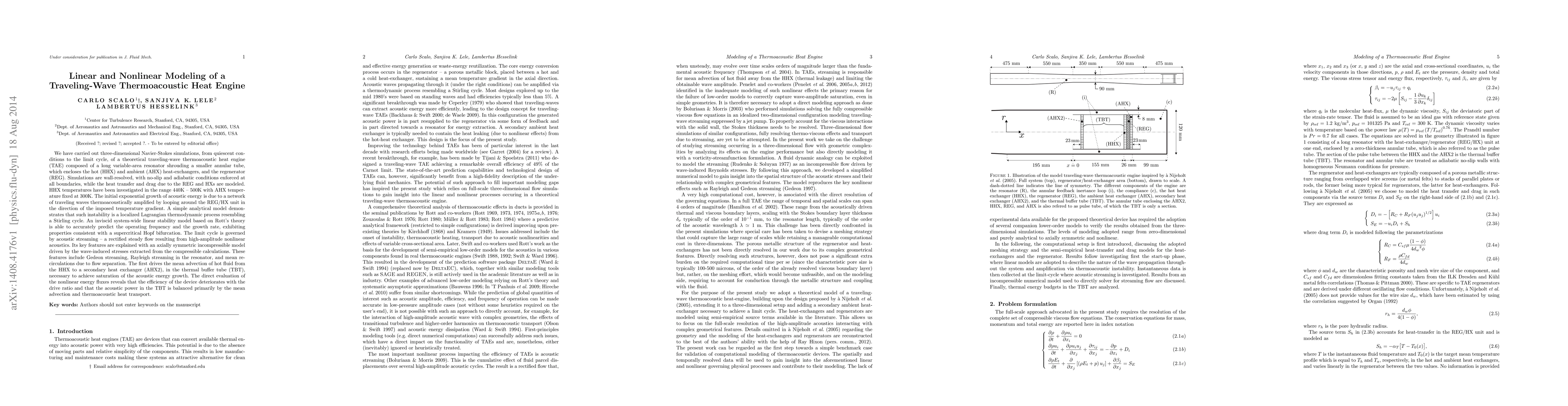 We have carried out three-dimensional Navier-Stokes simulations, from quiescent conditions to the limit cycle, of a traveling-wave thermoacoustic heat engine (TAE) composed of a long variable-area resonator shrouding a smaller annular tube, which encloses the hot (HHX) and ambient (AHX) heat-exchangers, and the regenerator (REG). Simulations are wall-resolved, with no-slip and adiabatic conditions enforced at all boundaries, while the heat transfer and drag due to the REG and HXs are modeled. HHX temperatures have been investigated in the range 440K - 500K with AHX temperature fixed at 300K. The initial exponential growth of acoustic energy is due to a network of traveling waves amplified by looping around the REG/HX unit in the direction of the imposed temperature gradient. A simple analytical model demonstrates that such thermoacoustic instability is a Lagrangian thermodynamic process resembling a Stirling cycle. A system-wide linear stability model based on Rott's theory is able to accurately predict the frequency and the growth rate, exhibiting properties consistent with a supercritical Hopf bifurcation. The limit cycle is governed by acoustic streaming -- a rectified flow resulting from high-amplitude acoustics. Its key features are explained with an axially symmetric incompressible model driven by the wave-induced stresses extracted from the compressible calculations. These features include Gedeon streaming and mean recirculations due to flow separation. The first drives the mean advection of hot fluid from the HHX to a secondary heat exchanger (AHX2), in the thermal buffer tube (TBT), necessary to achieve saturation of the acoustic energy growth. The direct evaluation of the energy fluxes reveals that the efficiency of the device deteriorates with the drive ratio and that the acoustic power in the TBT is balanced primarily by the mean advection and thermoacoustic heat transport.