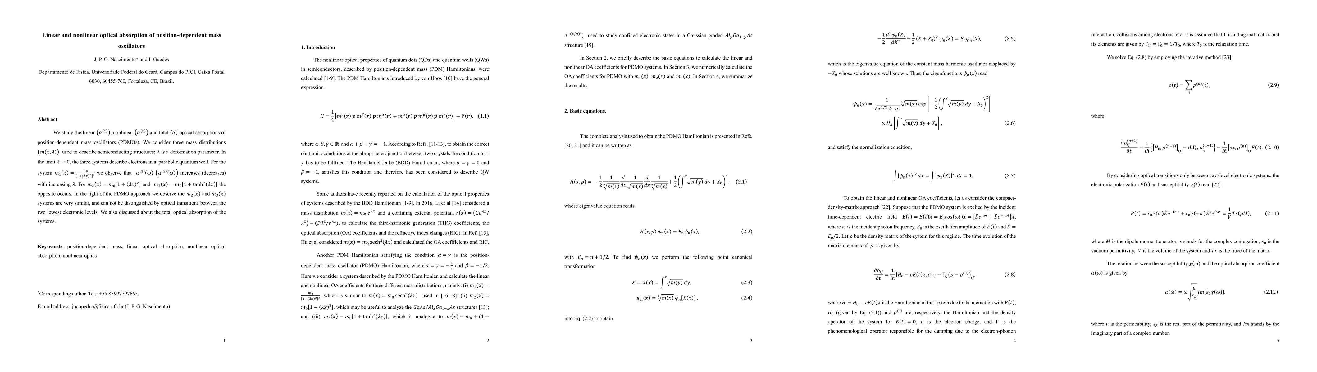 This paper investigates linear and nonlinear optical absorptions in position-dependent mass oscillators (PDMOs) with three mass distributions, revealing distinct behaviors with varying deformation parameters. The study finds that while some mass distributions show increasing linear absorption, others exhibit decreasing nonlinear absorption with increasing deformation, highlighting the complexity of optical transitions in semiconducting structures.