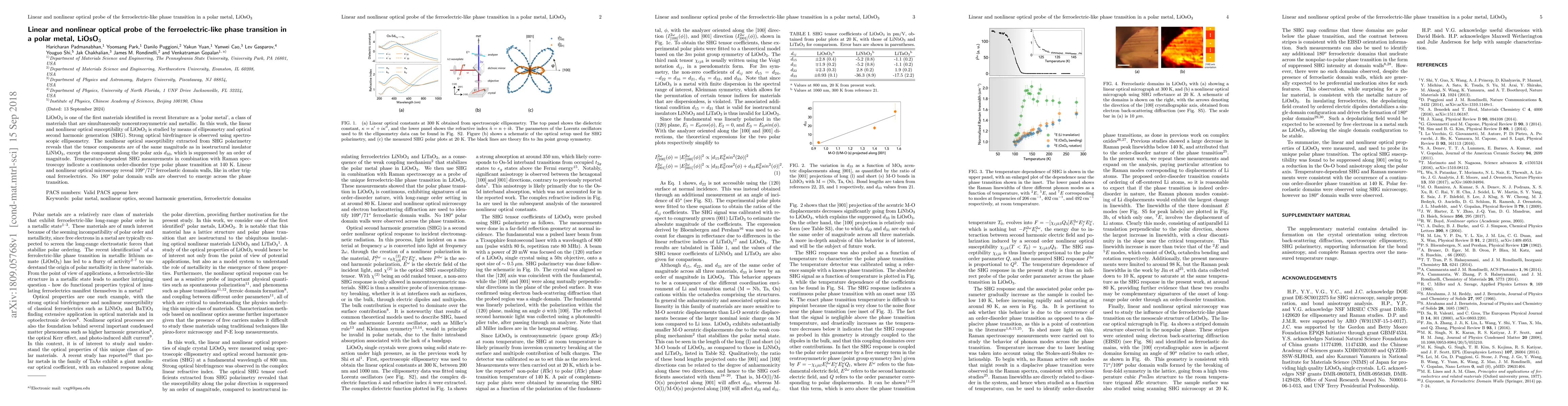 LiOsO3 is one of the first materials identified in a recent literature as a 'polar metal', a class of materials that are simultaneously noncentrosymmetric and metallic. In this work, the linear and nonlinear optical susceptibility of LiOsO3 is studied by means of ellipsometry and optical second harmonic generation (SHG). Strong optical birefringence is observed using spectroscopic ellipsometry. The nonlinear optical susceptibility extracted from SHG polarimetry reveals that the tensor components are of the same magnitude as in isostructural insulator LiNbO3, except the component along the polar axis d33, which is suppressed by an order of magnitude. Temperature-dependent SHG measurements in combination with Raman spectroscopy indicate a continuous order-disorder type polar phase transition at 140 K. Linear and nonlinear optical microscopy techniques reveal 109 deg/71 deg ferroelastic domain walls, like in other trigonal ferroelectrics. No 180 deg polar domain walls are observed to emerge across the phase transition.