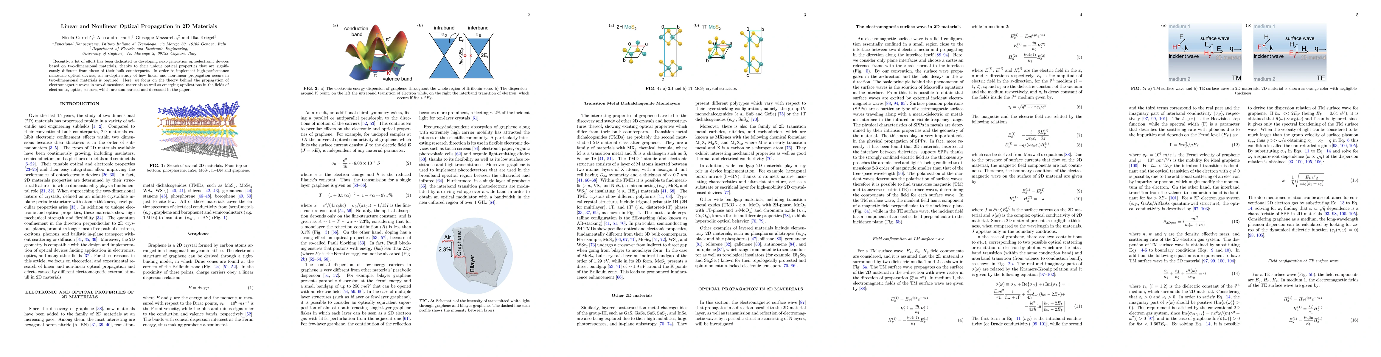 Recently, a lot of effort has been dedicated to developing next-generation optoelectronic devices based on two-dimensional materials, thanks to their unique optical properties that are significantly different from those of their bulk counterparts. In order to implement high-performance nanoscale optical devices, an in-depth study of how linear and non-linear propagation occurs in two-dimensional materials is required. Here, we focus on the theory behind the propagation of electromagnetic waves in two-dimensional materials as well as emerging applications in the fields of electronics, optics, sensors, which are summarized and discussed in the paper.