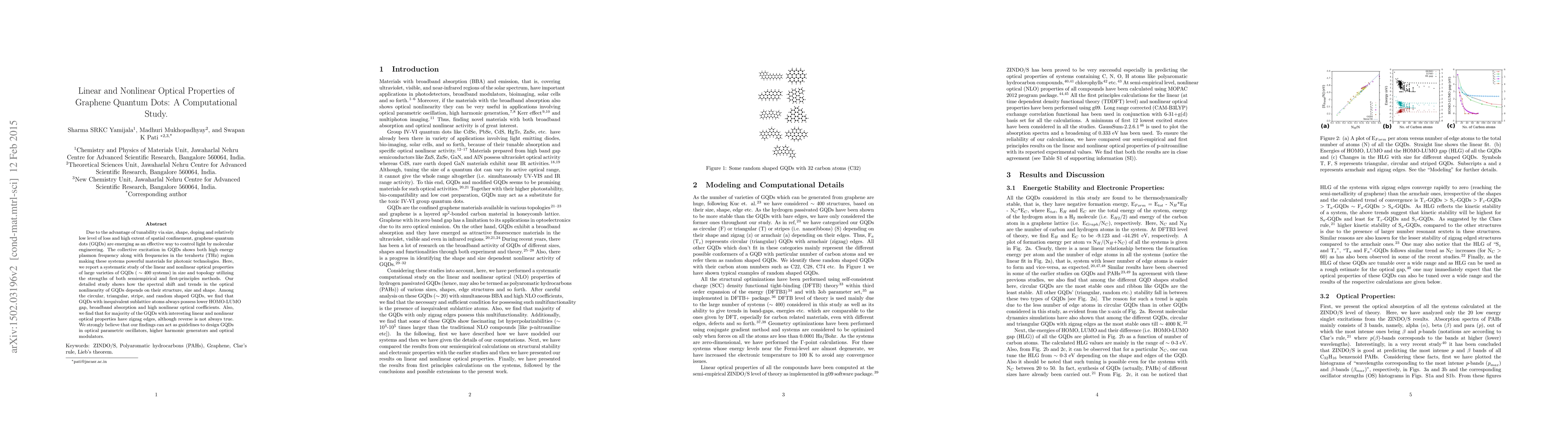 This study systematically investigates linear and nonlinear optical properties of 400 graphene quantum dots (GQDs) using semiempirical and first-principles methods. Key findings include that GQDs with inequivalent sublattice atoms have lower HOMO-LUMO gaps, broadband absorption, and high nonlinear optical coefficients. Zigzag-edged GQDs exhibit interesting linear and nonlinear optical properties, suggesting potential for use in photonic devices like optical parametric oscillators and modulators.