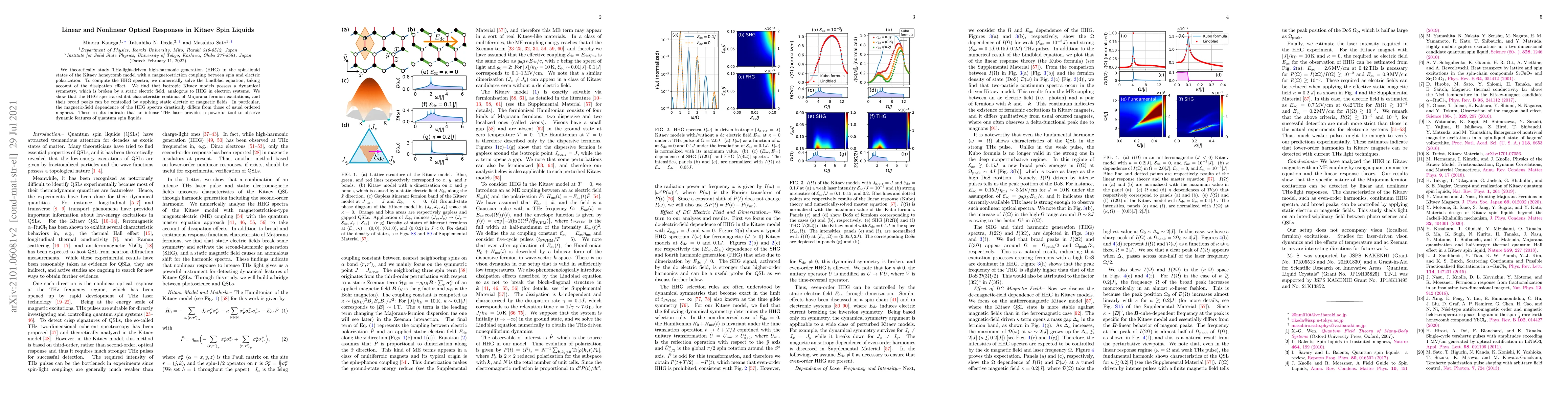We theoretically study THz-light-driven high-harmonic generation (HHG) in the spin-liquid states of the Kitaev honeycomb model with a magnetostriction coupling between spin and electric polarization. To compute the HHG spectra, we numerically solve the Lindblad equation, taking account of the dissipation effect. We find that isotropic Kitaev models possess a dynamical symmetry, which is broken by a static electric field, analogous to HHG in electron systems. We show that the HHG spectra exhibit characteristic continua of Majorana fermion excitations, and their broad peaks can be controlled by applying static electric or magnetic fields. In particular, the magnetic-field dependence of the HHG spectra drastically differs from those of usual ordered magnets. These results indicate that an intense THz laser provides a powerful tool to observe dynamic features of quantum spin liquids.