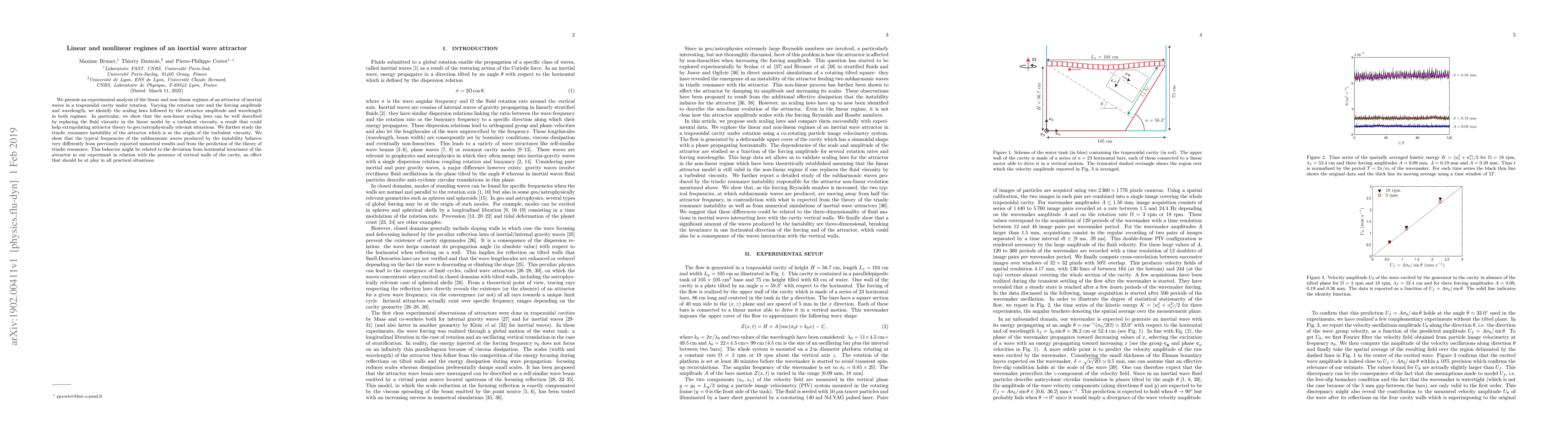 We present an experimental analysis of the linear and non-linear regimes of an attractor of inertial waves in a trapezoidal cavity under rotation. Varying the rotation rate and the forcing amplitude and wavelength, we identify the scaling laws followed by the attractor amplitude and wavelength in both regimes. In particular, we show that the non-linear scaling laws can be well described by replacing the fluid viscosity in the linear model by a turbulent viscosity, a result that could help extrapolating attractor theory to geo/astrophysically relevant situations. We further study the triadic resonance instability of the attractor which is at the origin of the turbulent viscosity. We show that the typical frequencies of the subharmonic waves produced by the instability behaves very differently from previously reported numerical results and from the prediction of the theory of triadic resonance. This behavior might be related to the deviation from horizontal invariance of the attractor in our experiment in relation with the presence of vertical walls of the cavity, an effect that should be at play in all practical situations.