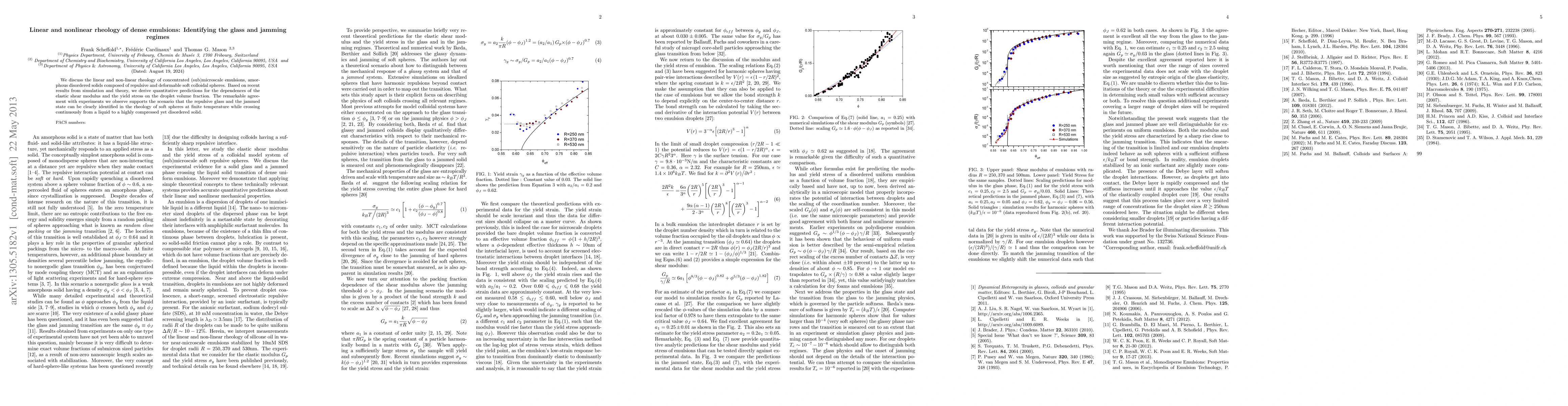 This paper investigates the rheological behavior of dense emulsions, focusing on the transition between liquid and solid states, identifying the glass and jamming regimes. It provides quantitative predictions for elastic shear modulus and yield stress based on simulations and theory, showing strong experimental support for the continuous transition from liquid to a disordered solid.